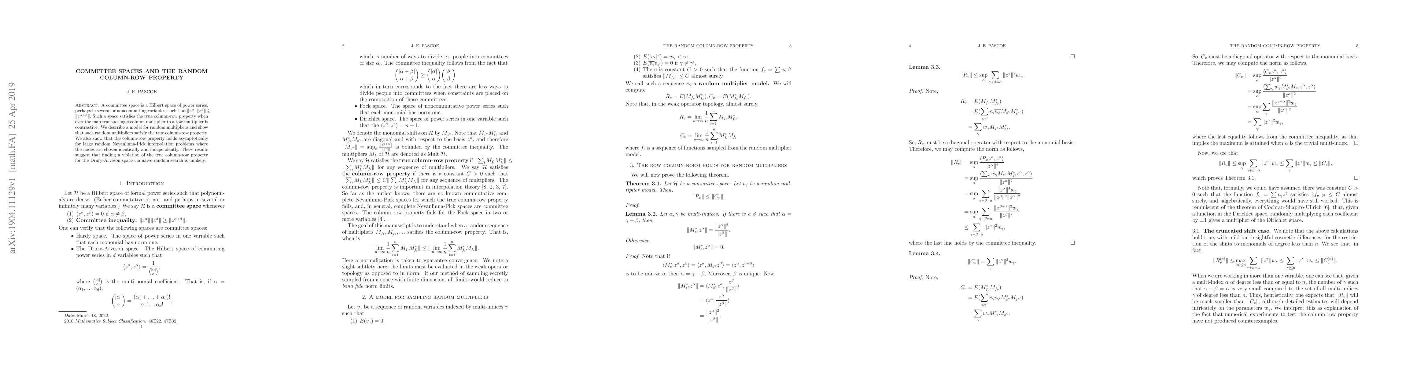This paper explores committee spaces with a focus on the random column-row property, demonstrating that random multipliers within such spaces satisfy this property. It also shows that large random Nevanlinna-Pick interpolation problems maintain the column-row property asymptotically, suggesting that na\"ive random searches are unlikely to find violations in the Drury-Arveson space.