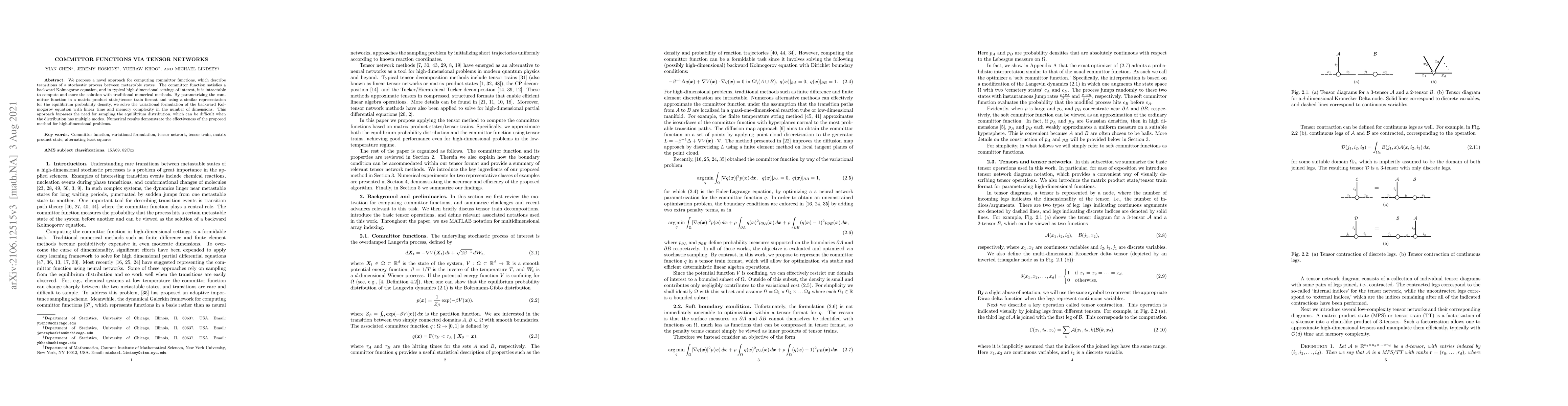 We propose a novel approach for computing committor functions, which describe transitions of a stochastic process between metastable states. The committor function satisfies a backward Kolmogorov equation, and in typical high-dimensional settings of interest, it is intractable to compute and store the solution with traditional numerical methods. By parametrizing the committor function in a matrix product state/tensor train format and using a similar representation for the equilibrium probability density, we solve the variational formulation of the backward Kolmogorov equation with linear time and memory complexity in the number of dimensions. This approach bypasses the need for sampling the equilibrium distribution, which can be difficult when the distribution has multiple modes. Numerical results demonstrate the effectiveness of the proposed method for high-dimensional problems.