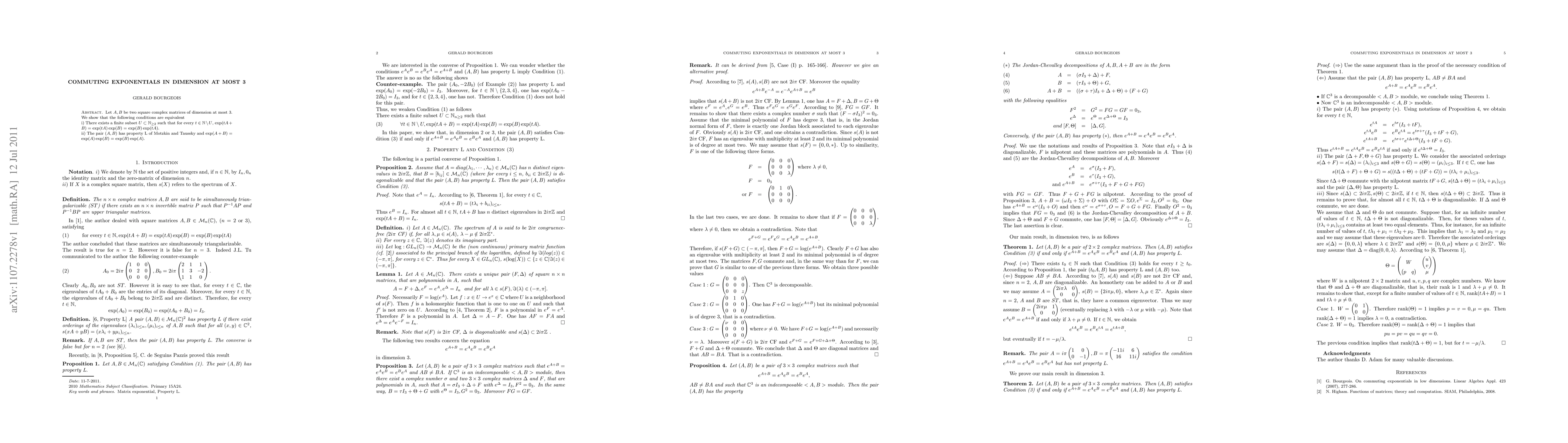 Let A,B be two square complex matrices of dimension at most 3. We show that the following conditions are equivalent i) There exists a finite subset U included in {2,3,4,...} such that for every positive integer t that is not in U, exp(tA+B)=exp(tA)exp(B)=exp(B)exp(tA). ii) The pair (A,B) has property L of Motzkin and Taussky and exp(A+B)=exp(A)exp(B)=exp(B)exp(A).