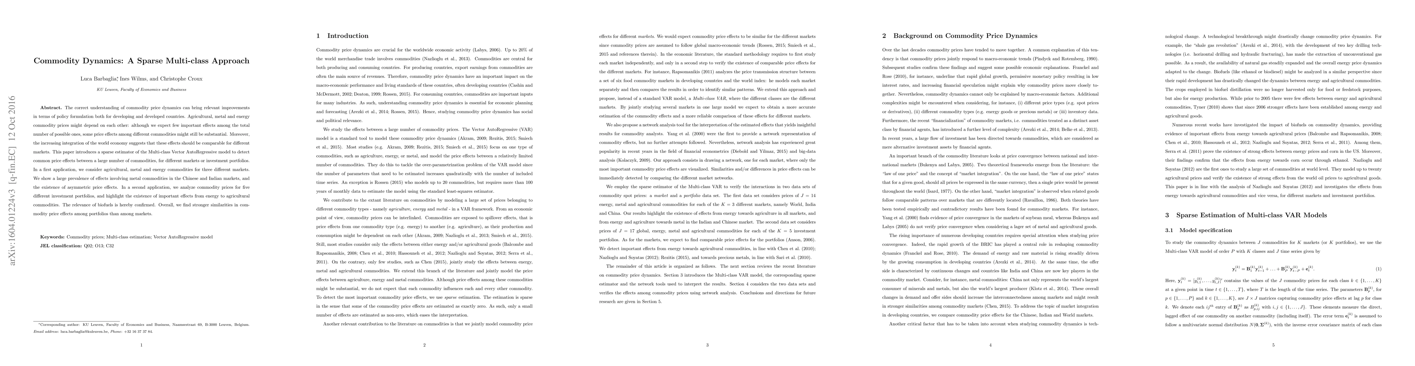 The correct understanding of commodity price dynamics can bring relevant improvements in terms of policy formulation both for developing and developed countries. Agricultural, metal and energy commodity prices might depend on each other: although we expect few important effects among the total number of possible ones, some price effects among different commodities might still be substantial. Moreover, the increasing integration of the world economy suggests that these effects should be comparable for different markets. This paper introduces a sparse estimator of the Multi-class Vector AutoRegressive model to detect common price effects between a large number of commodities, for different markets or investment portfolios. In a first application, we consider agricultural, metal and energy commodities for three different markets. We show a large prevalence of effects involving metal commodities in the Chinese and Indian markets, and the existence of asymmetric price effects. In a second application, we analyze commodity prices for five different investment portfolios, and highlight the existence of important effects from energy to agricultural commodities. The relevance of biofuels is hereby confirmed. Overall, we find stronger similarities in commodity price effects among portfolios than among markets.