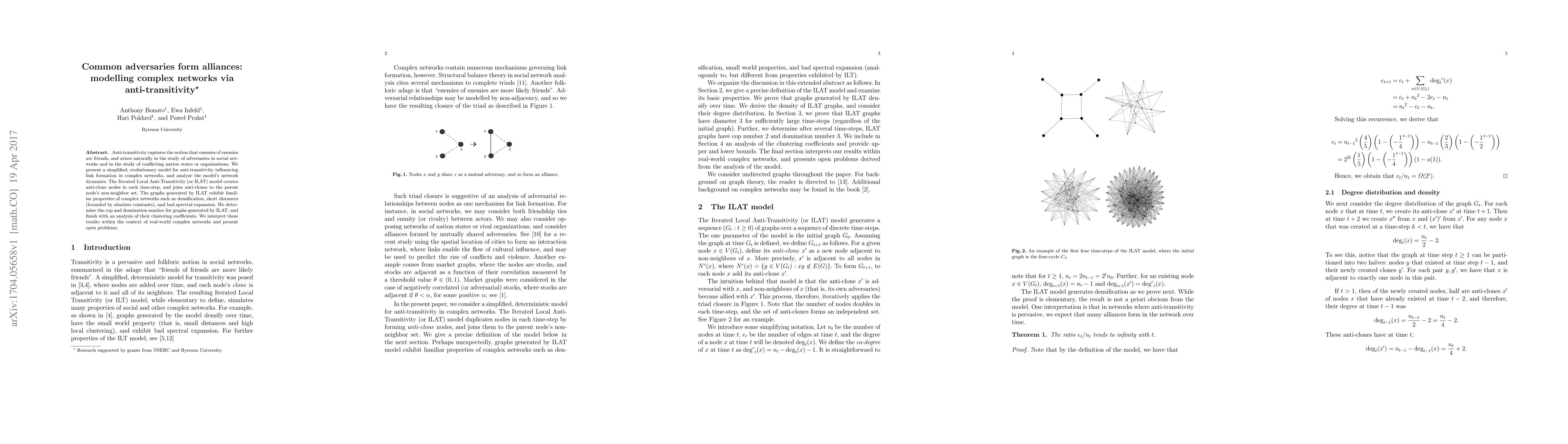 Anti-transitivity captures the notion that enemies of enemies are friends, and arises naturally in the study of adversaries in social networks and in the study of conflicting nation states or organizations. We present a simplified, evolutionary model for anti-transitivity influencing link formation in complex networks, and analyze the model's network dynamics. The Iterated Local Anti-Transitivity (or ILAT) model creates anti-clone nodes in each time-step, and joins anti-clones to the parent node's non-neighbor set. The graphs generated by ILAT exhibit familiar properties of complex networks such as densification, short distances (bounded by absolute constants), and bad spectral expansion. We determine the cop and domination number for graphs generated by ILAT, and finish with an analysis of their clustering coefficients. We interpret these results within the context of real-world complex networks and present open problems.