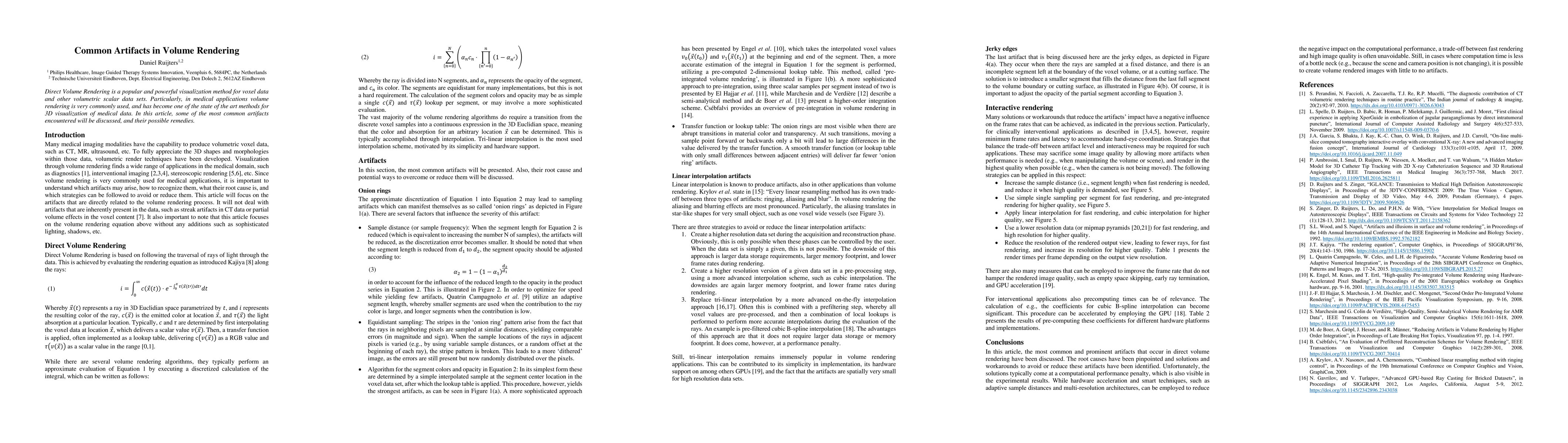 Direct Volume Rendering is a popular and powerful visualization method for voxel data and other volumetric scalar data sets. Particularly, in medical applications volume rendering is very commonly used, and has become one of the state of the art methods for 3D visualization of medical data. In this article, some of the most common artifacts encountered will be discussed, and their possible remedies.