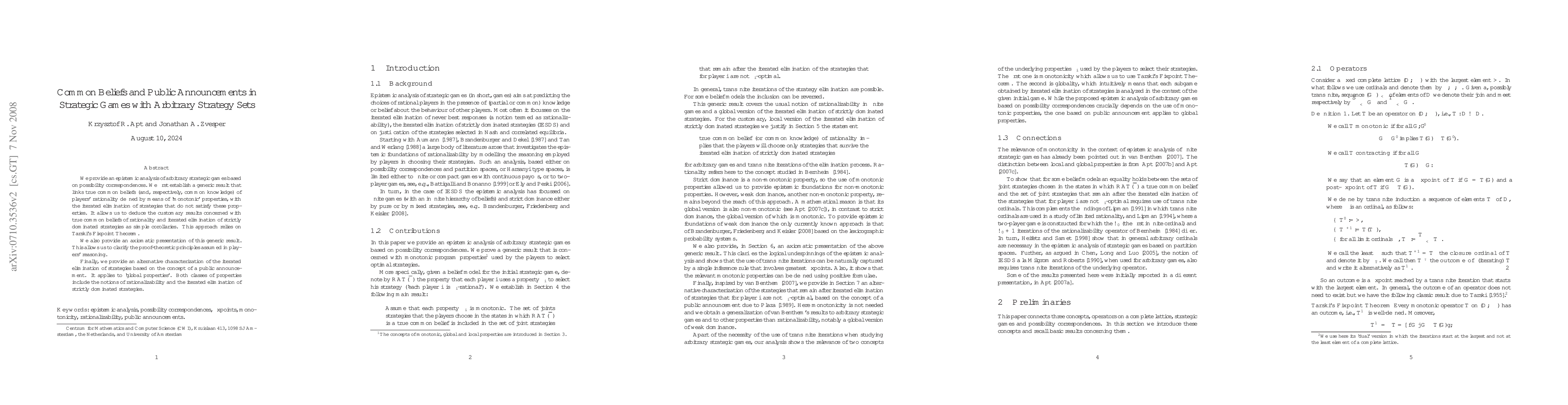 We provide an epistemic analysis of arbitrary strategic games based on possibility correspondences. We first establish a generic result that links true common beliefs (and, respectively, common knowledge) of players' rationality defined by means of `monotonic' properties, with the iterated elimination of strategies that do not satisfy these properties. It allows us to deduce the customary results concerned with true common beliefs of rationality and iterated elimination of strictly dominated strategies as simple corollaries. This approach relies on Tarski's Fixpoint Theorem. We also provide an axiomatic presentation of this generic result. This allows us to clarify the proof-theoretic principles assumed in players' reasoning. Finally, we provide an alternative characterization of the iterated elimination of strategies based on the concept of a public announcement. It applies to `global properties'. Both classes of properties include the notions of rationalizability and the iterated elimination of strictly dominated strategies.