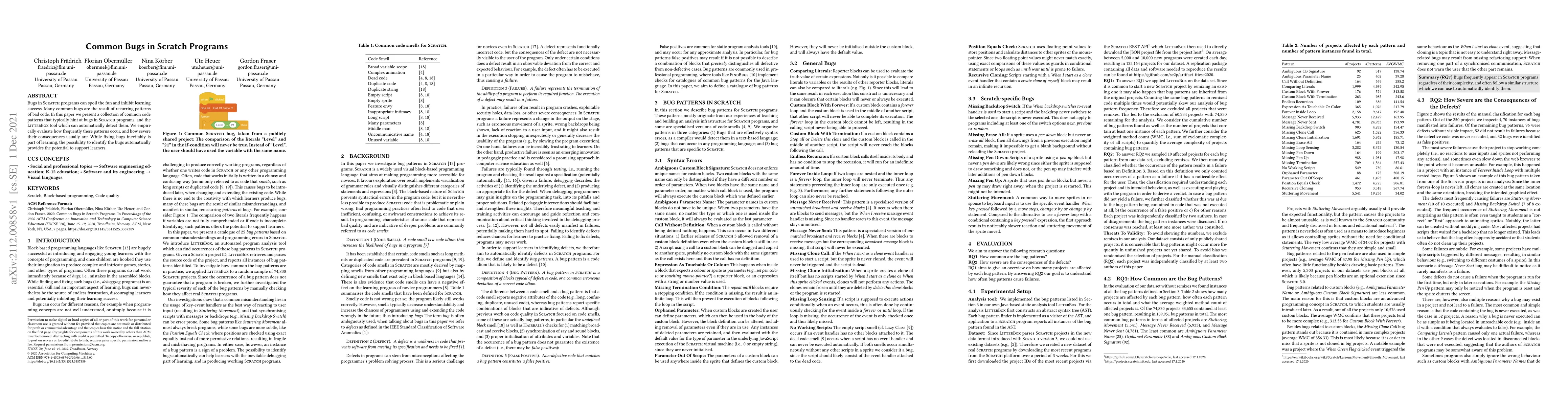 This paper identifies common code patterns that often lead to bugs in Scratch programs and introduces the LitterBox tool for their automatic detection. The study evaluates the frequency and severity of these patterns, aiming to support learners by facilitating automated bug identification.