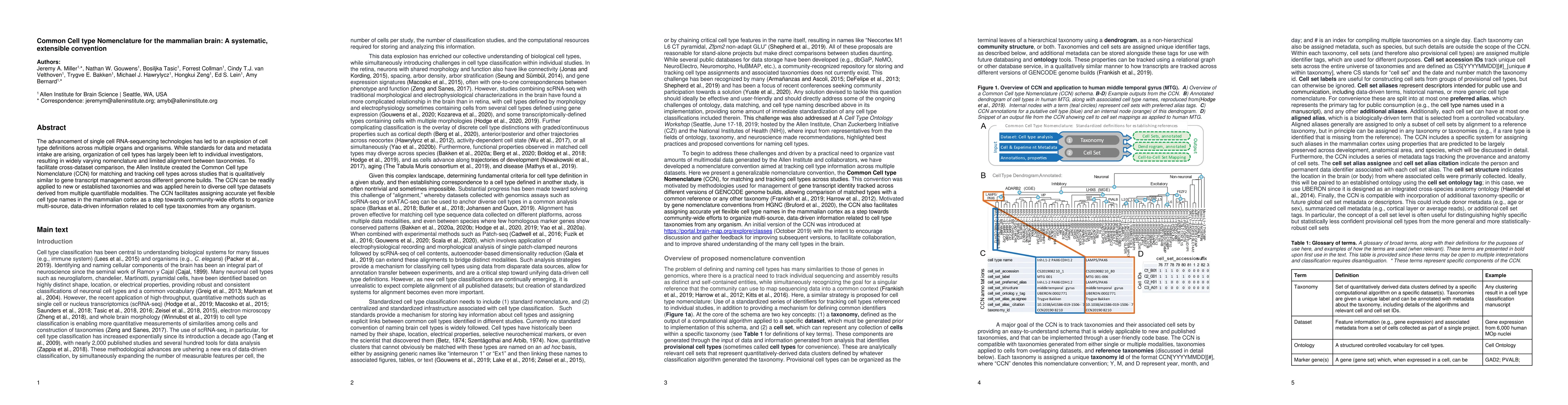 The advancement of single cell RNA-sequencing technologies has led to an explosion of cell type definitions across multiple organs and organisms. While standards for data and metadata intake are arising, organization of cell types has largely been left to individual investigators, resulting in widely varying nomenclature and limited alignment between taxonomies. To facilitate cross-dataset comparison, the Allen Institute created the Common Cell type Nomenclature (CCN) for matching and tracking cell types across studies that is qualitatively similar to gene transcript management across different genome builds. The CCN can be readily applied to new or established taxonomies and was applied herein to diverse cell type datasets derived from multiple quantifiable modalities. The CCN facilitates assigning accurate yet flexible cell type names in the mammalian cortex as a step towards community-wide efforts to organize multi-source, data-driven information related to cell type taxonomies from any organism.