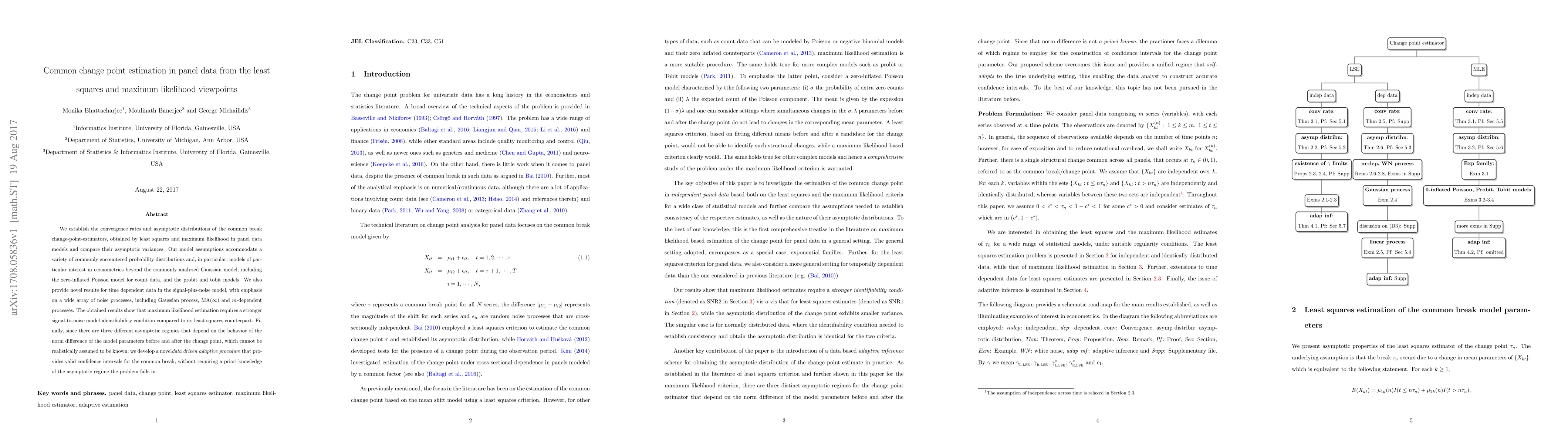 We establish the convergence rates and asymptotic distributions of the common break change-point estimators, obtained by least squares and maximum likelihood in panel data models and compare their asymptotic variances. Our model assumptions accommodate a variety of commonly encountered probability distributions and, in particular, models of particular interest in econometrics beyond the commonly analyzed Gaussian model, including the zero-inflated Poisson model for count data, and the probit and tobit models. We also provide novel results for time dependent data in the signal-plus-noise model, with emphasis on a wide array of noise processes, including Gaussian process, MA$(\infty)$ and $m$-dependent processes. The obtained results show that maximum likelihood estimation requires a stronger signal-to-noise model identifiability condition compared to its least squares counterpart. Finally, since there are three different asymptotic regimes that depend on the behavior of the norm difference of the model parameters before and after the change point, which cannot be realistically assumed to be known, we develop a novel data driven adaptive procedure that provides valid confidence intervals for the common break, without requiring a priori knowledge of the asymptotic regime the problem falls in.