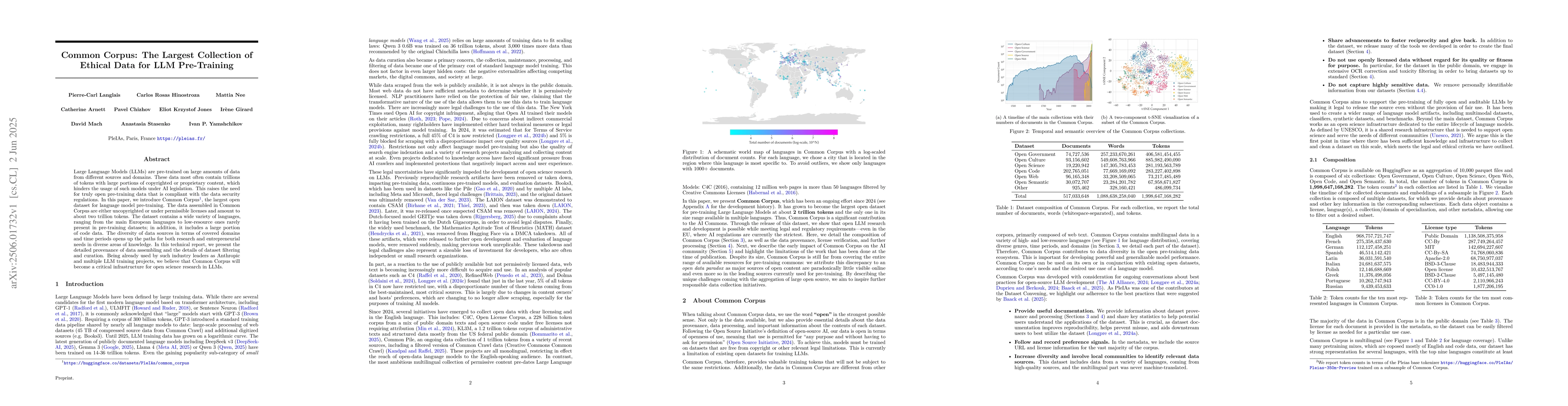 Common Corpus is the largest open dataset for language model pre-training, containing 2 trillion tokens from uncopyrighted or licensed sources, addressing AI legislation concerns. It offers a critical infrastructure for open science research in LLMs.
