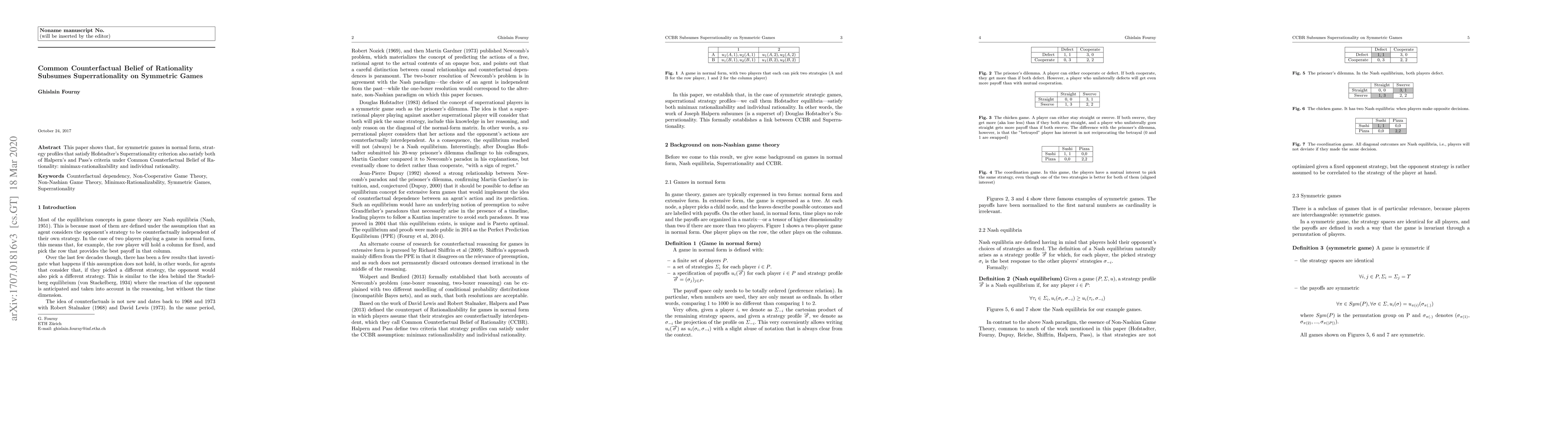 This paper shows that, for symmetric games in normal form, strategy profiles that satisfy Hofstadter's Superrationality criterion also satisfy both of Halpern's and Pass's criteria under Common Counterfactual Belief of Rationality: minimax-rationalizability and individual rationality.