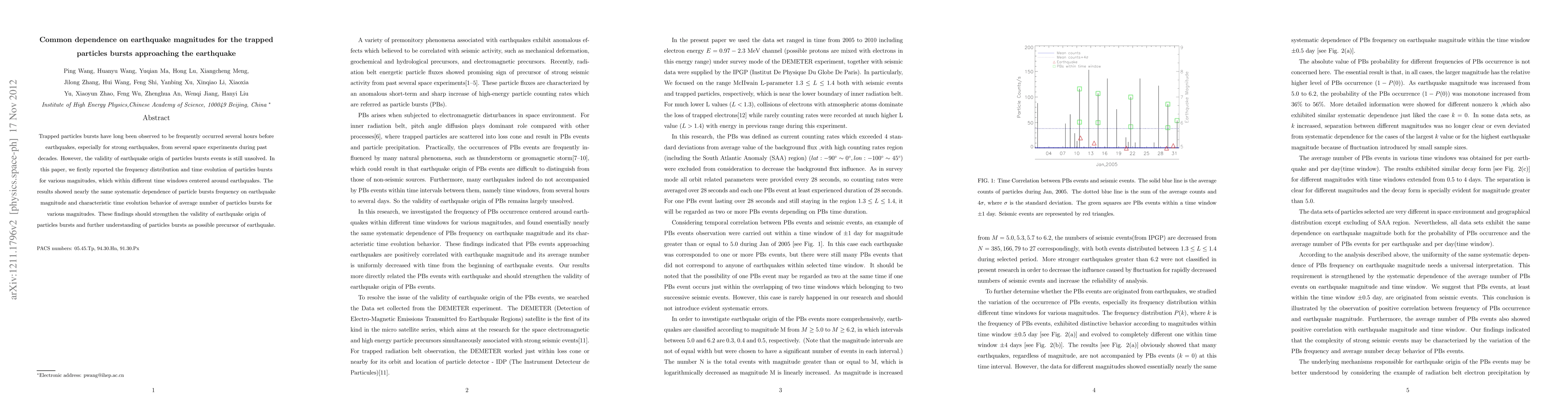 This paper investigates trapped particles bursts observed before earthquakes, finding a consistent dependence on earthquake magnitude and characteristic time decay behavior across different magnitudes. These results support the hypothesis that particles bursts may serve as precursors for earthquakes.