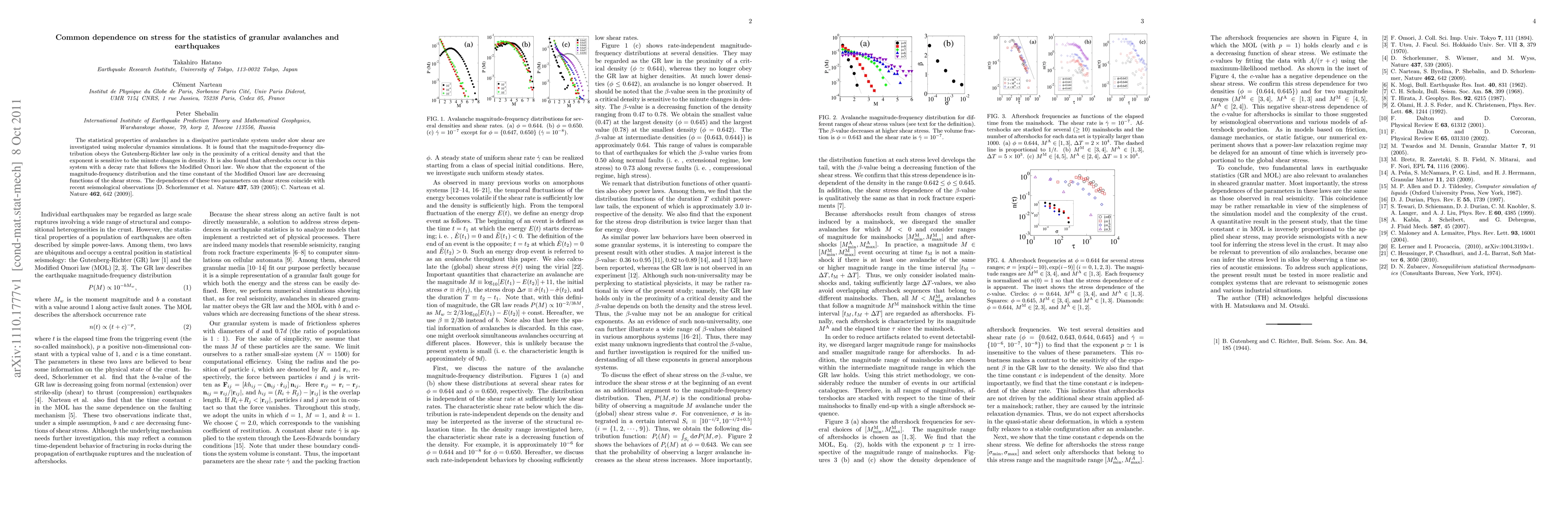 This paper investigates the statistical properties of granular avalanches under shear using molecular dynamics simulations, finding that their magnitude-frequency distribution follows the Gutenberg-Richter law near critical density. It also reveals a Modified Omori law for aftershocks and shows that both the magnitude-frequency exponent and the aftershock decay rate are stress-dependent, mirroring recent seismological observations.