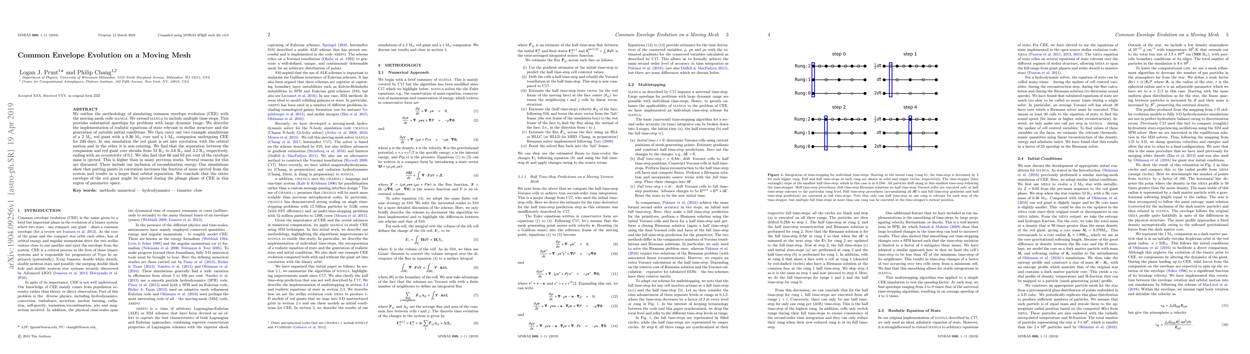 We outline the methodology of simulating common envelope evolution (CEE) with the moving-mesh code MANGA. We extend MANGA to include multiple time-steps. This provides substantial speedups for problems with large dynamic range. We describe the implementation of realistic equations of state relevant in stellar structure and the generation of suitable initial conditions. We then carry out two example simulations of a 2 $\rm{M}_{\odot}$ red giant with a 0.36 $\rm{M}_{\odot}$ core and a 1 $\rm{M}_{\odot}$ companion undergoing CEE for 240 days. In one simulation the red giant is set into corotation with the orbital motion and in the other it is non-rotating. We find that the separation between the companion and red giant core shrinks from 52 $\rm{R}_{\odot}$ to 3.6 $\rm{R}_{\odot}$ and 3.2 $\rm{R}_{\odot}$ respectively, ending with an eccentricity of 0.1. We also find that 66 and 63 per cent of the envelope mass is ejected. This is higher than in many previous works. Several reasons for this are discussed. These include our inclusion of recombination energy. Our simulations show that putting giants in corotation increases the fraction of mass ejected from the system and results in a larger final orbital separation. We conclude that the entire envelope of the red giant might be ejected during the plunge phase of CEE in this region of parameter space.