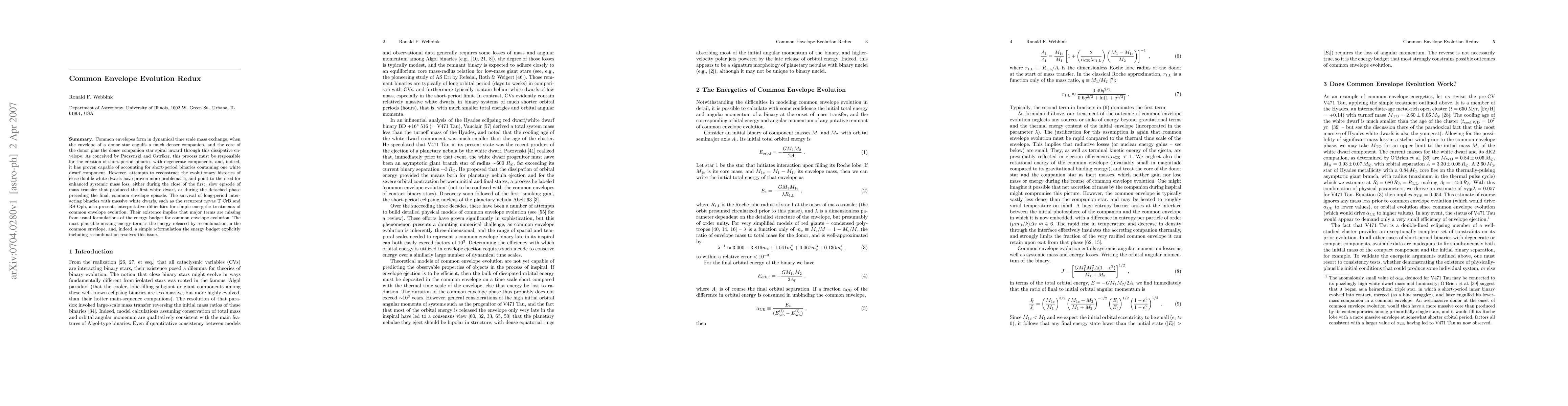 Common envelopes form in dynamical time scale mass exchange, when the envelope of a donor star engulfs a much denser companion, and the core of the donor plus the dense companion star spiral inward through this dissipative envelope. As conceived by Paczynski and Ostriker, this process must be responsible for the creation of short-period binaries with degenerate components, and, indeed, it has proven capable of accounting for short-period binaries containing one white dwarf component. However, attempts to reconstruct the evolutionary histories of close double white dwarfs have proven more problematic, and point to the need for enhanced systemic mass loss, either during the close of the first, slow episode of mass transfer that produced the first white dwarf, or during the detached phase preceding the final, common envelope episode. The survival of long-period interacting binaries with massive white dwarfs, such as the recurrent novae T CrB and RS Oph, also presents interpretative difficulties for simple energetic treatments of common envelope evolution. Their existence implies that major terms are missing from usual formulations of the energy budget for common envelope evolution. The most plausible missing energy term is the energy released by recombination in the common envelope, and, indeed, a simple reformulation the energy budget explicitly including recombination resolves this issue.