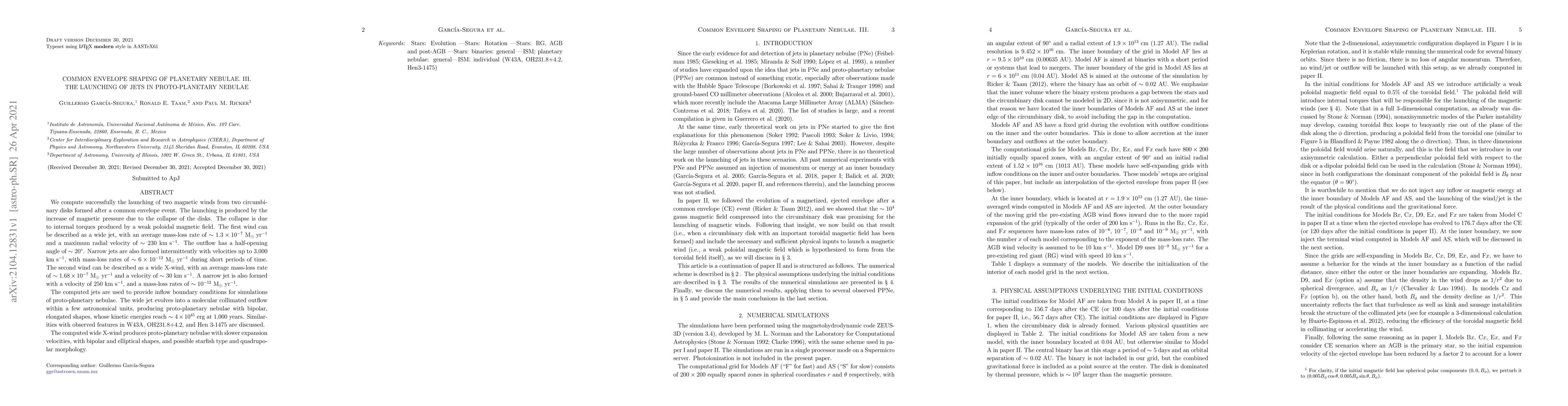 We compute successfully the launching of two magnetic winds from two circumbinary disks formed after a common envelope event. The launching is produced by the increase of magnetic pressure due to the collapse of the disks. The collapse is due to internal torques produced by a weak poloidal magnetic field. The first wind can be described as a wide jet, with an average mass-loss rate of $\sim 1.3 \times 10^{-7}$ \Moy\ and a maximum radial velocity of $\sim 230$ \kms. The outflow has a half-opening angle of $\sim 20^{\circ}$. Narrow jets are also formed intermittently with velocities up to 3,000 \kms, with mass-loss rates of $\sim 6 \times 10^{-12} $ \Moy\ during short periods of time. The second wind can be described as a wide X-wind, with an average mass-loss rate of $\sim 1.68 \times 10^{-7}$ \Moy\ and a velocity of $\sim 30$ \kms. A narrow jet is also formed with a velocity of 250 \kms, and a mass-loss rates of $\sim 10^{-12} $ \Moy. The computed jets are used to provide inflow boundary conditions for simulations of proto-planetary nebulae. The wide jet evolves into a molecular collimated outflow within a few astronomical units, producing proto-planetary nebulae with bipolar, elongated shapes, whose kinetic energies reach $\sim 4 \times 10^{45}$ erg at 1,000 years. Similarities with observed features in W43A, OH231.8+4.2, and Hen 3-1475 are discussed. The computed wide X-wind produces proto-planetary nebulae with slower expansion velocities, with bipolar and elliptical shapes, and possible starfish type and quadrupolar morphology.