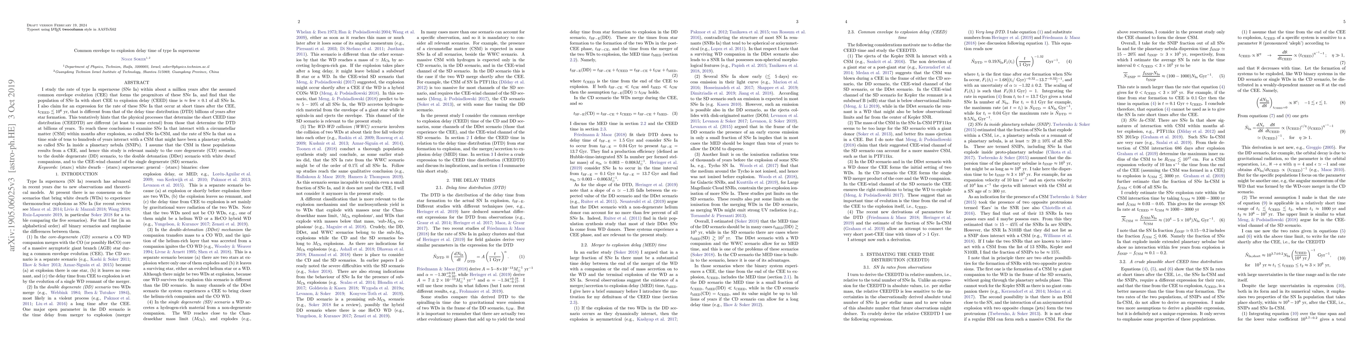 I study the rate of type Ia supernovae (SNe Ia) within about a million years after the assumed common envelope evolution (CEE) that forms the progenitors of these SNe Ia, and find that the population of SNe Ia with short CEE to explosion delay (CEED) time is ~fewx0.1 of all SNe Ia. I also claim for an expression for the rate of these SNe Ia that occur at short times after the CEE, t(CEED)<10^6 year, that is different from that of the delay time distribution (DTD) billions of years after star formation. This tentatively hints that the physical processes that determine the short CEED time distribution (CEEDTD) are different (at least to some extend) from those that determine the DTD at billions of years. To reach these conclusions I examine SNe Ia that interact with a circumstellar matter (CSM) within months after explosion, so called SNe Ia-CSM, and the rate of SNe Ia that on a time scale of tens to hundreds of years interact with a CSM that might have been a planetary nebula, so called SNe Ia inside a planetary nebula (SNIPs). I assume that the CSM in these populations results from a CEE, and hence this study is relevant mainly to the core degenerate (CD) scenario, to the double degenerate (DD) scenario, to the double detonation (DDet) scenario with white dwarf companions, and to the CEE-wind channel of the single degenerate (SD) scenario.