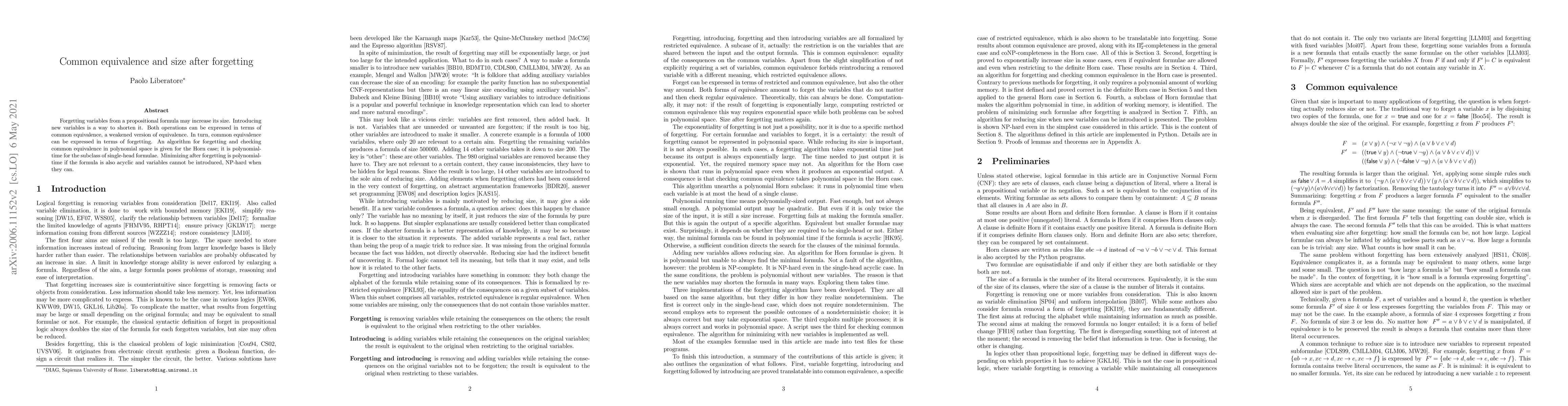 Research shows that forgetting variables from a propositional formula can increase its size, but introducing new variables can shorten it. A polynomial algorithm for forgetting and checking common equivalence has been developed.