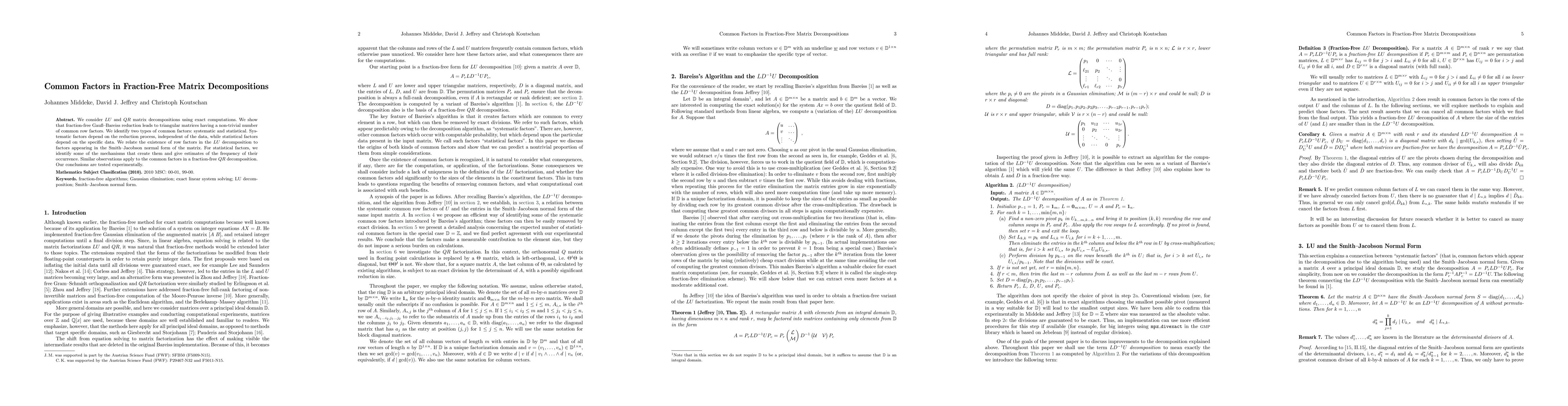 The paper investigates common factors in fraction-free matrix decompositions of LU and QR matrices, identifying systematic and statistical factors that appear in both decompositions, with experimental testing to validate the findings.