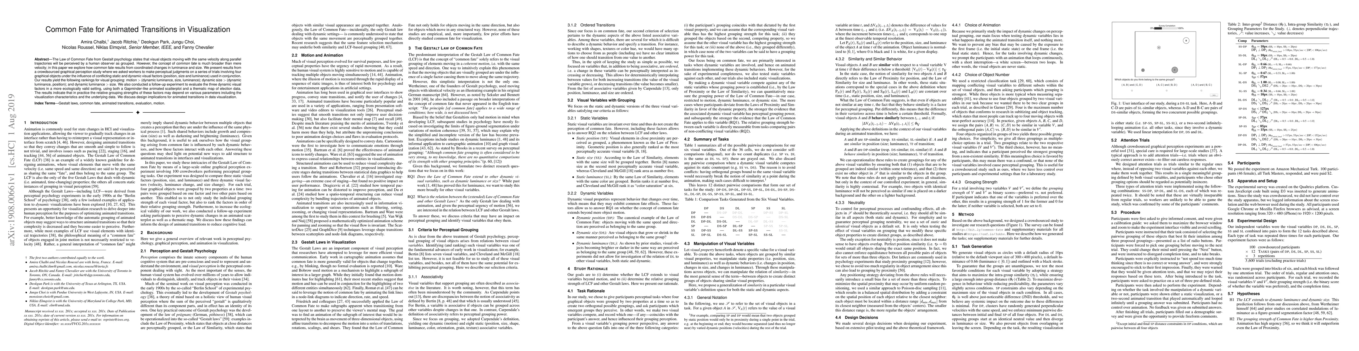 The Law of Common Fate from Gestalt psychology states that visual objects moving with the same velocity along parallel trajectories will be perceived by a human observer as grouped. However, the concept of common fate is much broader than mere velocity; in this paper we explore how common fate results from coordinated changes in luminance and size. We present results from a crowdsourced graphical perception study where we asked workers to make perceptual judgments on a series of trials involving four graphical objects under the influence of conflicting static and dynamic visual factors (position, size and luminance) used in conjunction. Our results yield the following rankings for visual grouping: motion > (dynamic luminance, size, luminance); dynamic size > (dynamic luminance, position); and dynamic luminance > size. We also conducted a follow-up experiment to evaluate the three dynamic visual factors in a more ecologically valid setting, using both a Gapminder-like animated scatterplot and a thematic map of election data. The results indicate that in practice the relative grouping strengths of these factors may depend on various parameters including the visualization characteristics and the underlying data. We discuss design implications for animated transitions in data visualization.