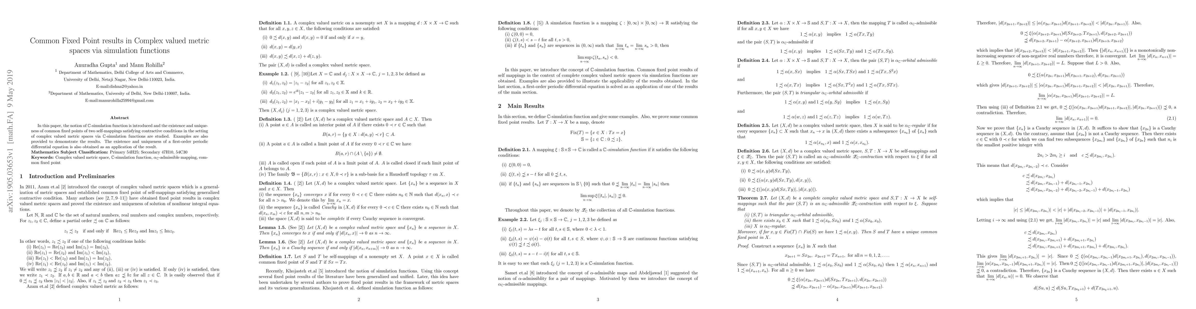 In this paper, the notion of $\mathbb{C}$-simulation function is introduced and the existence and uniqueness of common fixed points of two self-mappings satisfying contractive conditions in the setting of complex valued metric spaces via $\mathbb{C}$-simulation functions are studied. Examples are also provided to demonstrate the results. The existence and uniqueness of a first-order periodic differential equation is also obtained as an application of the result.