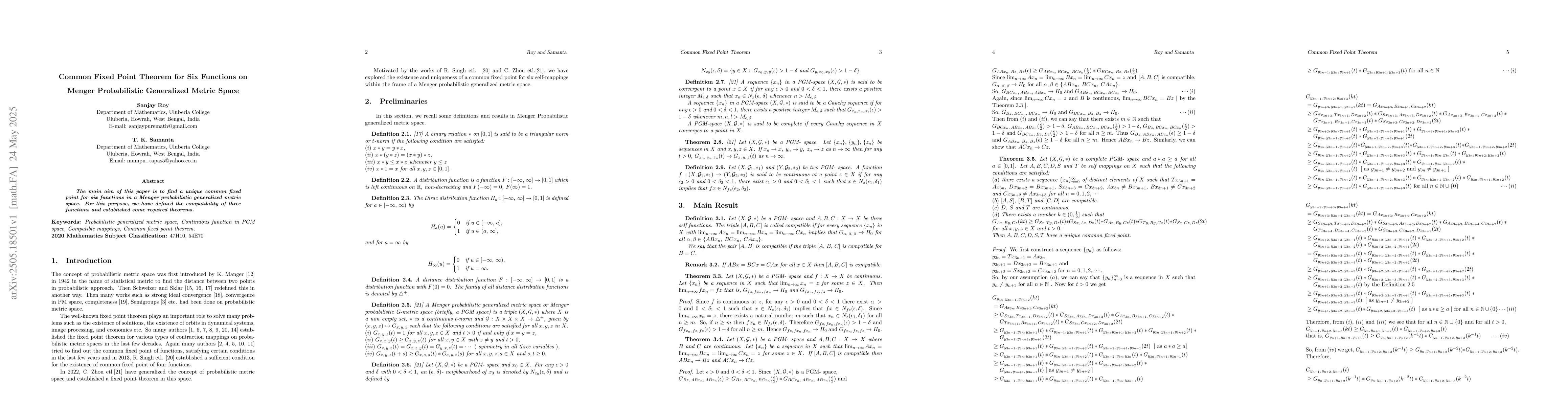 Researchers found a unique common fixed point for six functions in a Menger probabilistic generalized metric space, establishing a new theorem with implications for functional analysis.