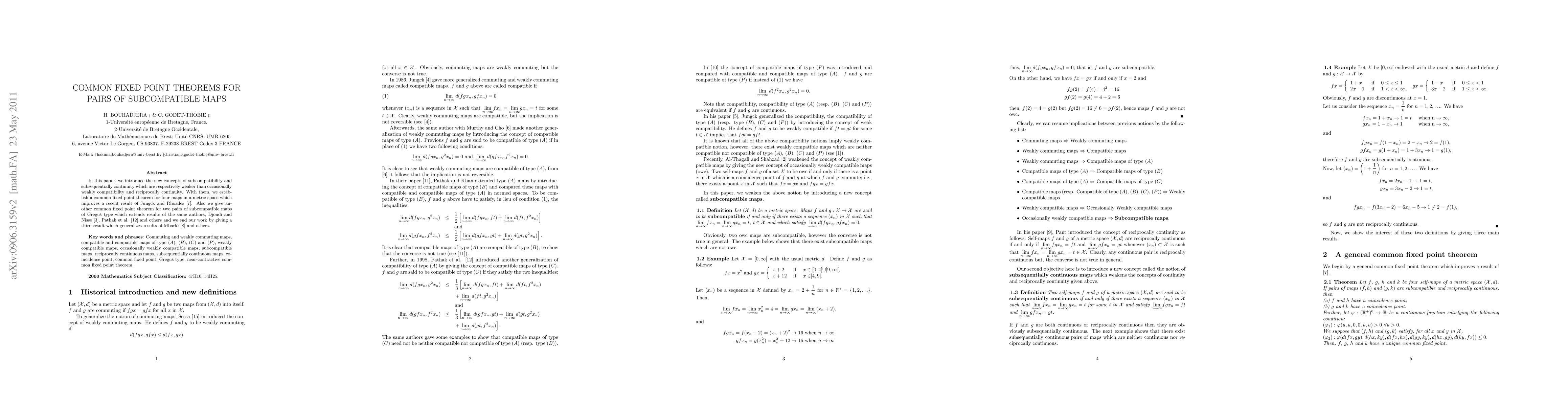 This paper introduces subcompatibility and subsequential continuity, weaker conditions than existing compatibility and continuity concepts, and establishes several new common fixed point theorems extending prior results from Jungck and Rhoades, Djoudi and Nisse, and Mbarki.