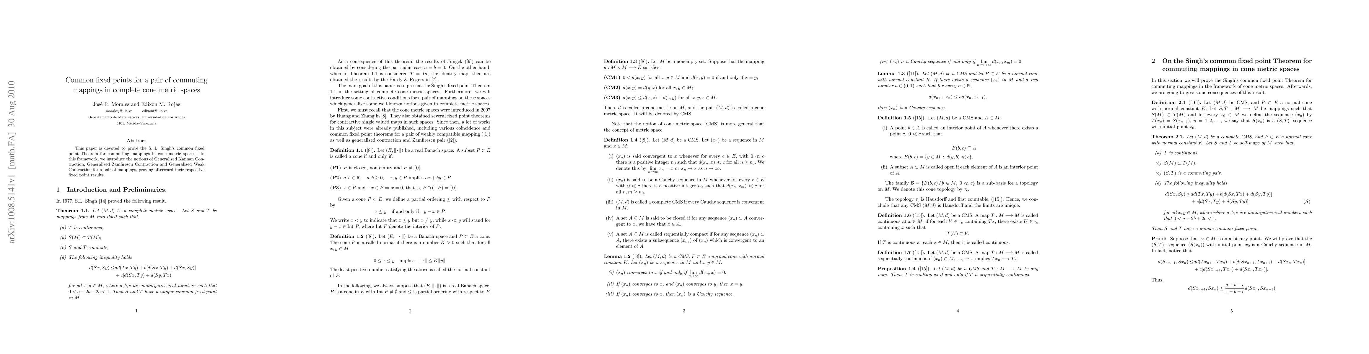 This paper proves S. L. Singh's common fixed point theorem for commuting mappings in cone metric spaces, introducing Generalized Kannan, Zamfirescu, and Weak Contractions and establishing their respective fixed point results.