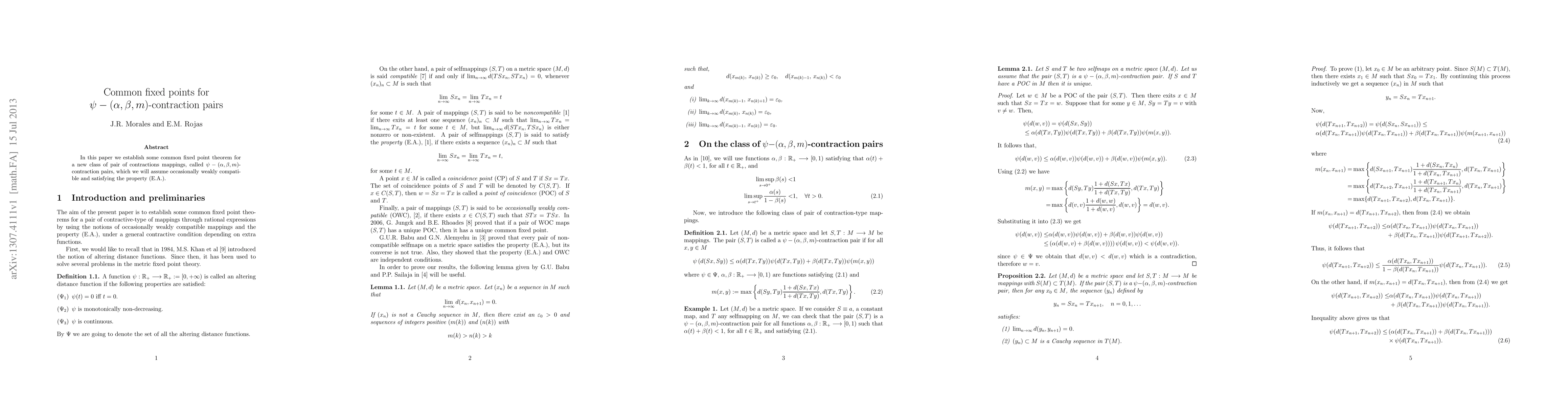 In this paper we establish some common fixed point theorem for a new class of pair of contractions mappings, called $\psi-(\alpha,\beta, m)$-contraction pairs, which we will assume occasionally weakly compatible and satisfying the property (E.A.).