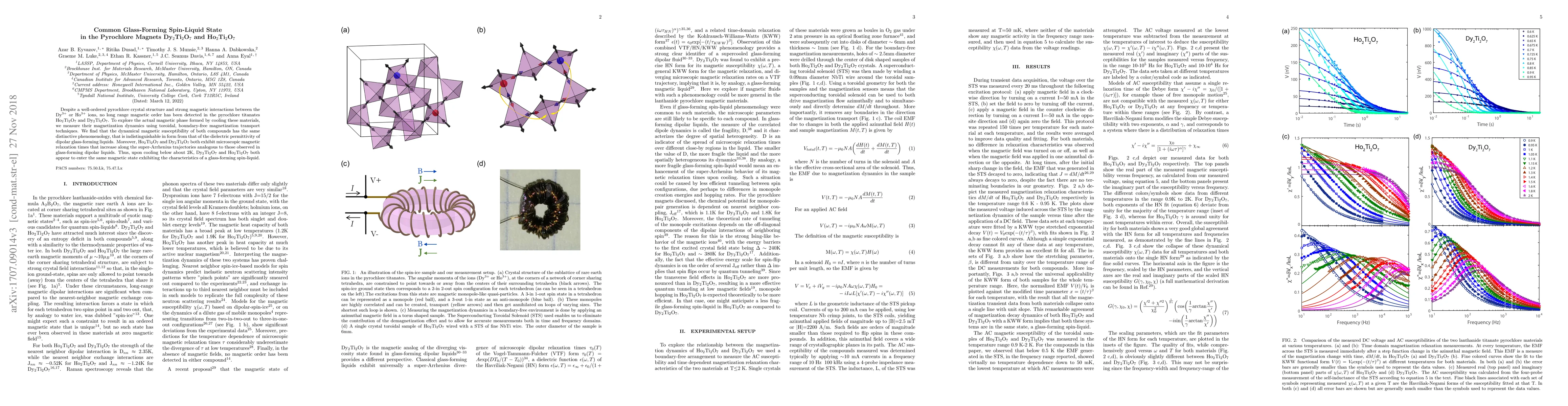 The paper reports that Dy$_2$Ti$_2$O$_7$ and Ho$_2$Ti$_2$O$_7$ pyrochlore magnets, despite strong magnetic interactions, exhibit no long-range magnetic order. Instead, they transition into a glass-forming spin-liquid state upon cooling, evidenced by similar dynamical magnetic susceptibility and super-Arrhenius magnetic relaxation times akin to dipolar glass-forming liquids.