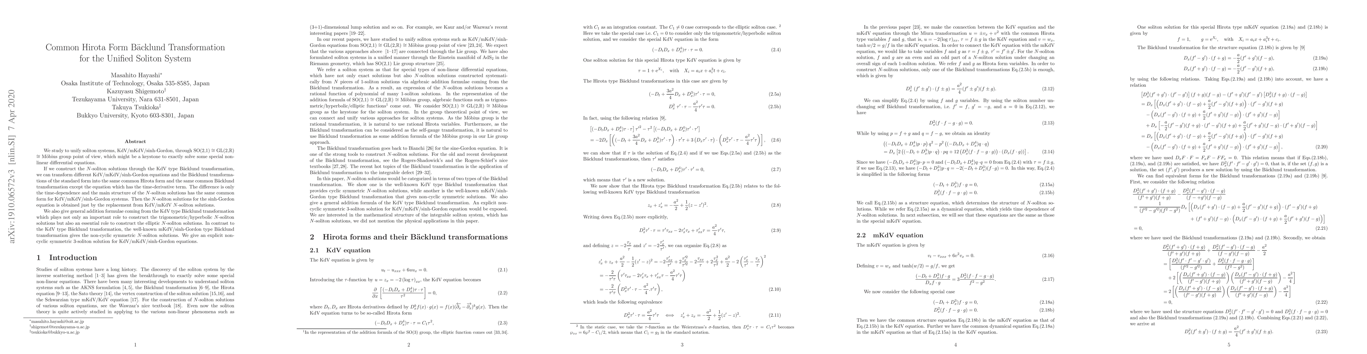 We study to unify soliton systems, KdV/mKdV/sinh-Gordon, through SO(2,1) $\cong$ GL(2,$\mathbb R$) $\cong$ M\"{o}bius group point of view, which might be a keystone to exactly solve some special non-linear differential equations. If we construct the $N$-soliton solutions through the KdV type B\"{a}cklund transformation, we can transform different KdV/mKdV/sinh-Gordon equations and the B\"{a}cklund transformations of the standard form into the same common Hirota form and the same common B\"{a}cklund transformation except the equation which has the time-derivative term. The difference is only the time-dependence and the main structure of the $N$-soliton solutions has same common form for KdV/mKdV/sinh-Gordon systems. Then the $N$-soliton solutions for the sinh-Gordon equation is obtained just by the replacement from KdV/mKdV $N$-soliton solutions. We also give general addition formulae coming from the KdV type B\"{a}cklund transformation which plays not only an important role to construct the trigonometric/hyperbolic $N$-soliton solutions but also an essential role to construct the elliptic $N$-soliton solutions. In contrast to the KdV type B\"{a}cklund transformation, the well-known mKdV/sinh-Gordon type B\"{a}cklund transformation gives the non-cyclic symmetric $N$-soliton solutions. We give an explicit non-cyclic symmetric 3-soliton solution for KdV/mKdV/sinh-Gordon equations.