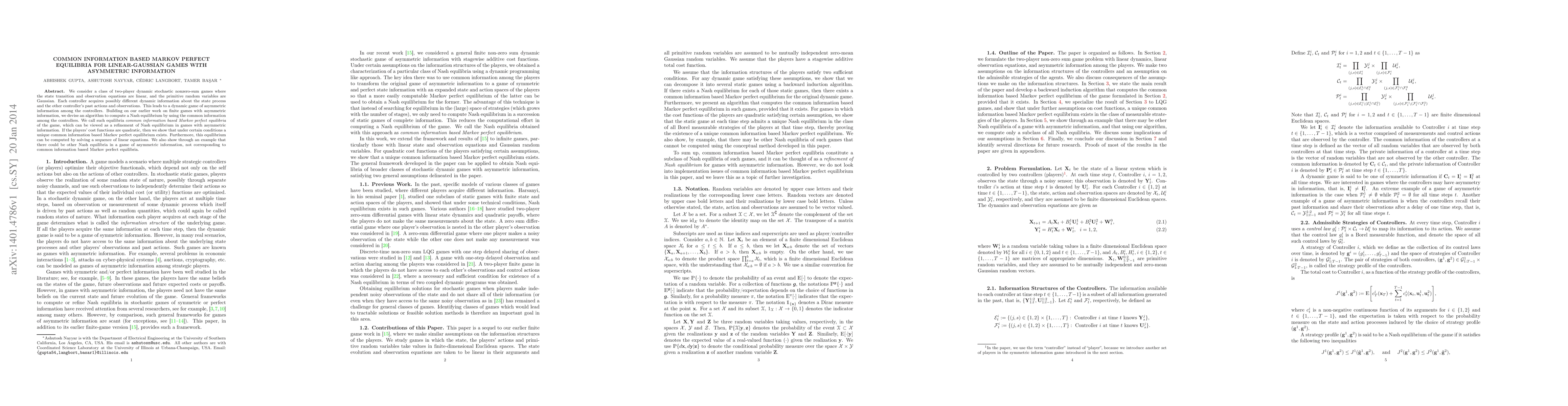 We consider a class of two-player dynamic stochastic nonzero-sum games where the state transition and observation equations are linear, and the primitive random variables are Gaussian. Each controller acquires possibly different dynamic information about the state process and the other controller's past actions and observations. This leads to a dynamic game of asymmetric information among the controllers. Building on our earlier work on finite games with asymmetric information, we devise an algorithm to compute a Nash equilibrium by using the common information among the controllers. We call such equilibria common information based Markov perfect equilibria of the game, which can be viewed as a refinement of Nash equilibrium in games with asymmetric information. If the players' cost functions are quadratic, then we show that under certain conditions a unique common information based Markov perfect equilibrium exists. Furthermore, this equilibrium can be computed by solving a sequence of linear equations. We also show through an example that there could be other Nash equilibria in a game of asymmetric information, not corresponding to common information based Markov perfect equilibria.