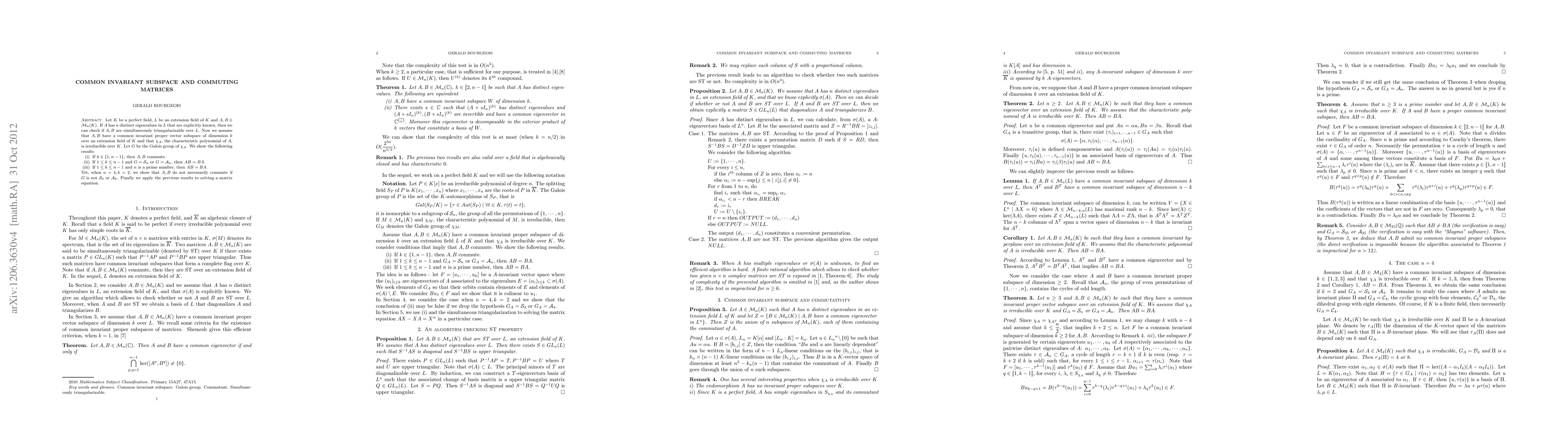 This paper investigates the conditions under which two matrices $A$ and $B$ commute when they share a common invariant subspace. It demonstrates that if $A$ and $B$ have a common invariant subspace of dimension $k$ (where $k\in\{1,n-1\}$), then $A$ and $B$ necessarily commute, provided certain irreducibility and Galois group conditions are met.