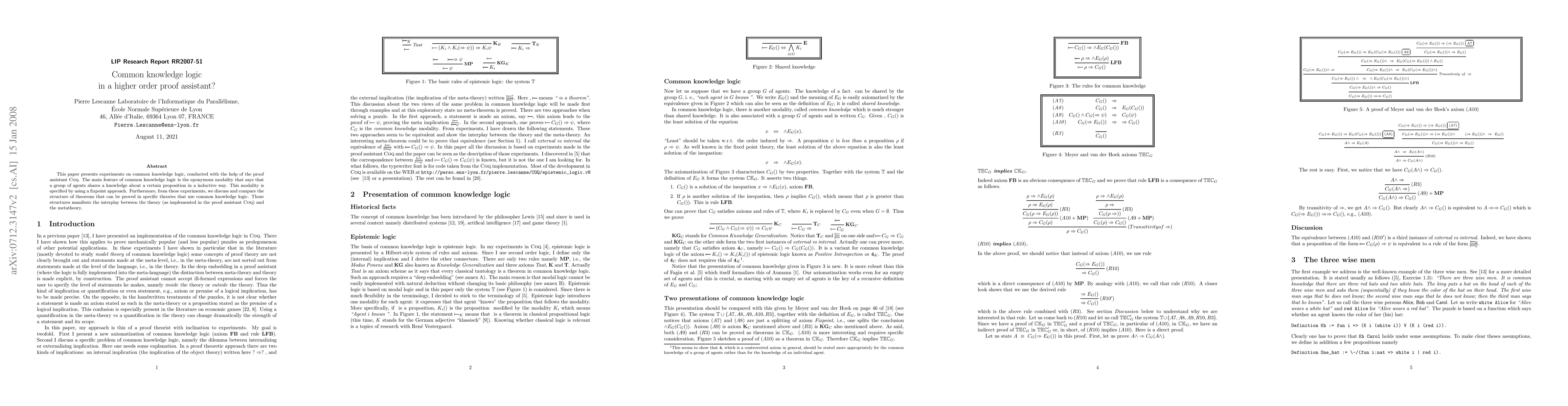 This paper explores the application of common knowledge logic in the proof assistant Coq, focusing on the inductive modality for shared knowledge among agents, and discusses the resulting theorem structures that reflect the interaction between the logic and its metatheory.