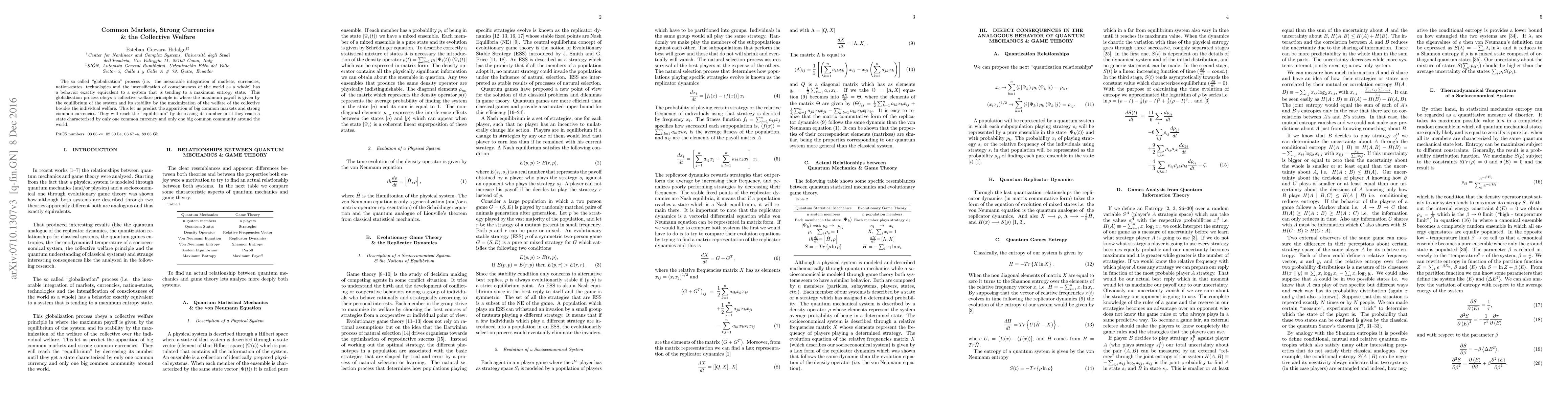 The so called "globalization" process (i.e. the inexorable integration of markets, currencies, nation-states, technologies and the intensification of consciousness of the world as a whole) has a behavior exactly equivalent to a system that is tending to a maximum entropy state. This globalization process obeys a collective welfare principle in where the maximum payoff is given by the equilibrium of the system and its stability by the maximization of the welfare of the collective besides the individual welfare. This let us predict the apparition of big common markets and strong common currencies. They will reach the "equilibrium" by decreasing its number until they reach a state characterized by only one common currency and only one big common community around the world.