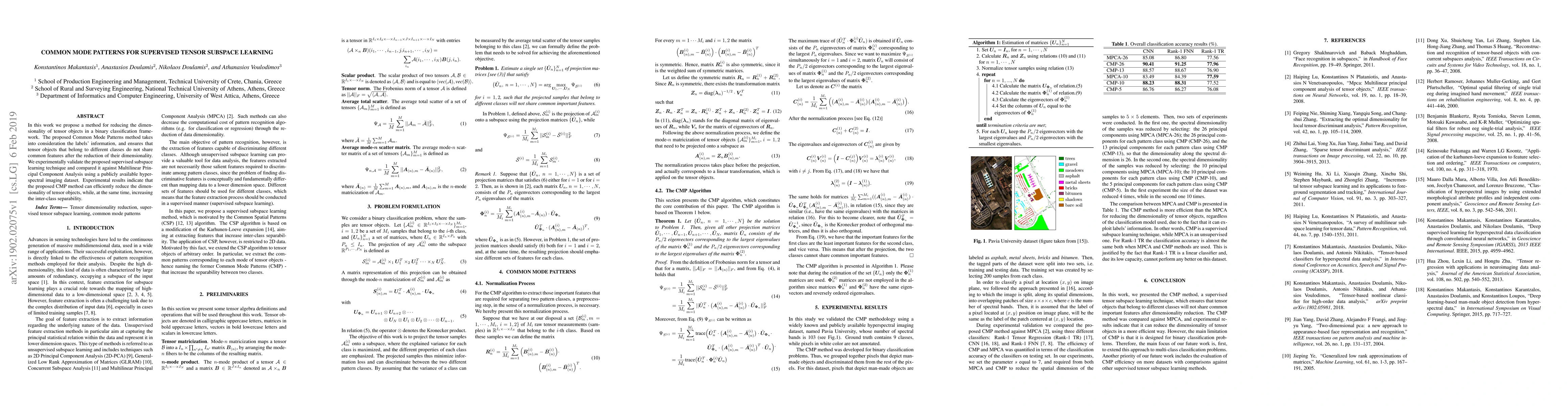 In this work we propose a method for reducing the dimensionality of tensor objects in a binary classification framework. The proposed Common Mode Patterns method takes into consideration the labels' information, and ensures that tensor objects that belong to different classes do not share common features after the reduction of their dimensionality. We experimentally validate the proposed supervised subspace learning technique and compared it against Multilinear Principal Component Analysis using a publicly available hyperspectral imaging dataset. Experimental results indicate that the proposed CMP method can efficiently reduce the dimensionality of tensor objects, while, at the same time, increasing the inter-class separability.