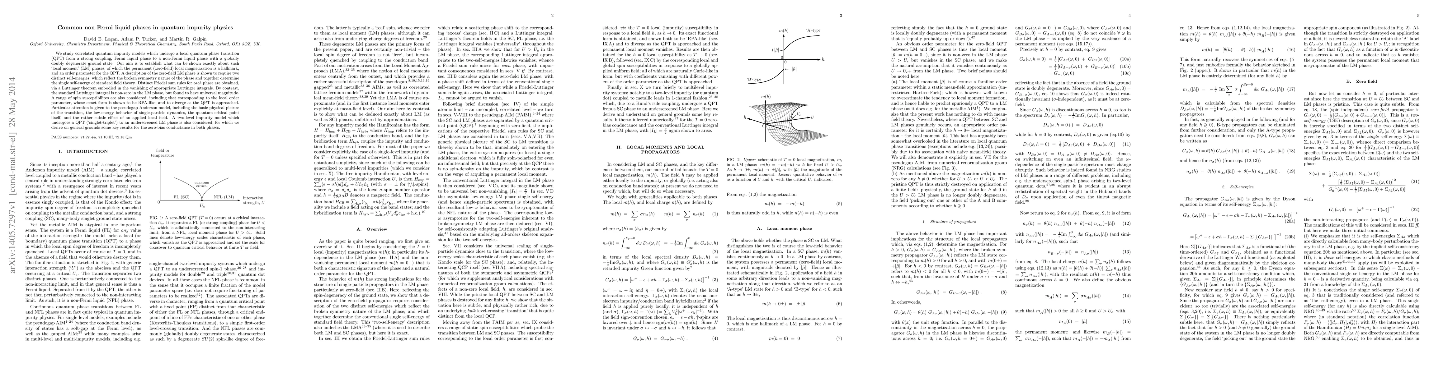 We study correlated quantum impurity models which undergo a local quantum phase transition (QPT) from a strong coupling, Fermi liquid phase to a non-Fermi liquid phase with a globally doubly degenerate ground state. Our aim is to establish what can be shown exactly about such `local moment' (LM) phases; of which the permanent (zero-field) local magnetization is a hallmark, and an order parameter for the QPT. A description of the zero-field LM phase is shown to require two distinct self-energies, which reflect the broken symmetry nature of the phase and together determine the single self-energy of standard field theory. Distinct Friedel sum rules for each phase are obtained, via a Luttinger theorem embodied in the vanishing of appropriate Luttinger integrals. By contrast, the standard Luttinger integral is non-zero in the LM phase, but found to have universal magnitude. A range of spin susceptibilites are also considered; including that corresponding to the local order parameter, whose exact form is shown to be RPA-like, and to diverge as the QPT is approached. Particular attention is given to the pseudogap Anderson model, including the basic physical picture of the transition, the low-energy behavior of single-particle dynamics, the quantum critical point itself, and the rather subtle effect of an applied local field. A two-level impurity model which undergoes a QPT (`singlet-triplet') to an underscreened LM phase is also considered, for which we derive on general grounds some key results for the zero-bias conductance in both phases.