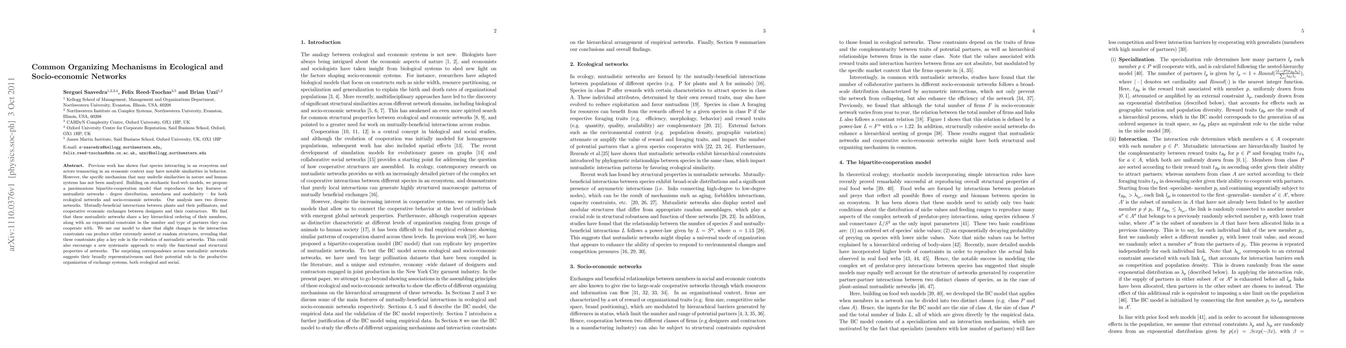 Previous work has shown that species interacting in an ecosystem and actors transacting in an economic context may have notable similarities in behavior. However, the specific mechanism that may underlie similarities in nature and human systems has not been analyzed. Building on stochastic food-web models, we propose a parsimonious bipartite-cooperation model that reproduces the key features of mutualistic networks - degree distribution, nestedness and modularity -- for both ecological networks and socio-economic networks. Our analysis uses two diverse networks. Mutually-beneficial interactions between plants and their pollinators, and cooperative economic exchanges between designers and their contractors. We find that these mutualistic networks share a key hierarchical ordering of their members, along with an exponential constraint in the number and type of partners they can cooperate with. We use our model to show that slight changes in the interaction constraints can produce either extremely nested or random structures, revealing that these constraints play a key role in the evolution of mutualistic networks. This could also encourage a new systematic approach to study the functional and structural properties of networks. The surprising correspondence across mutualistic networks suggests their broadly representativeness and their potential role in the productive organization of exchange systems, both ecological and social.