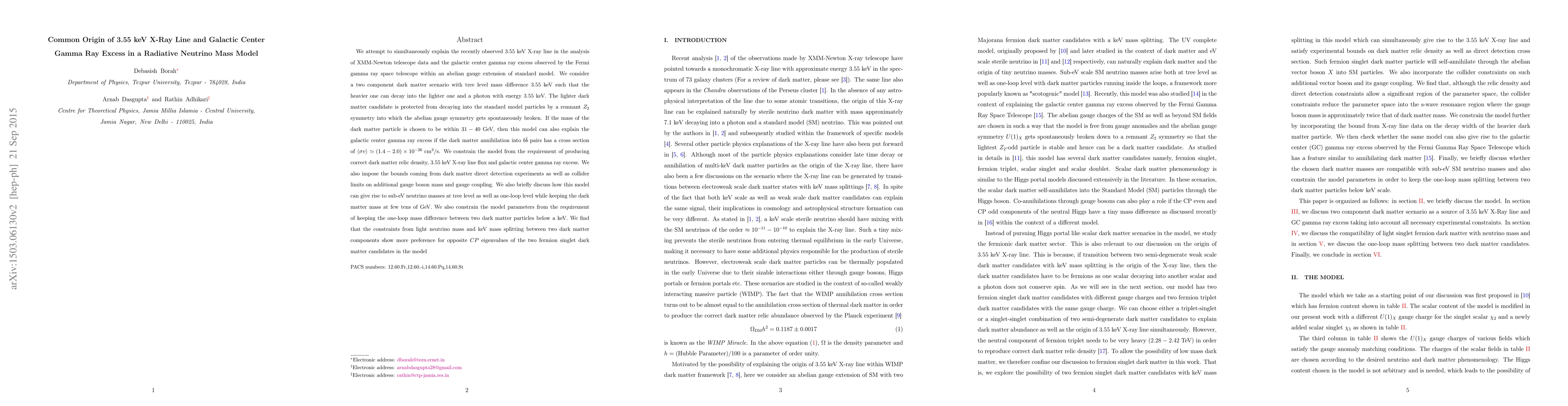 We attempt to simultaneously explain the recently observed 3.55 keV X-ray line in the analysis of XMM-Newton telescope data and the galactic center gamma ray excess observed by the Fermi gamma ray space telescope within an abelian gauge extension of standard model. We consider a two component dark matter scenario with tree level mass difference 3.55 keV such that the heavier one can decay into the lighter one and a photon with energy 3.55 keV. The lighter dark matter candidate is protected from decaying into the standard model particles by a remnant $Z_2$ symmetry into which the abelian gauge symmetry gets spontaneously broken. If the mass of the dark matter particle is chosen to be within $31-40$ GeV, then this model can also explain the galactic center gamma ray excess if the dark matter annihilation into $b\bar{b}$ pairs has a cross section of $\langle \sigma v \rangle \simeq (1.4-2.0) \times 10^{-26} \; \text{cm}^3/\text{s}$. We constrain the model from the requirement of producing correct dark matter relic density, 3.55 keV X-ray line flux and galactic center gamma ray excess. We also impose the bounds coming from dark matter direct detection experiments as well as collider limits on additional gauge boson mass and gauge coupling. We also briefly discuss how this model can give rise to sub-eV neutrino masses at tree level as well as one-loop level while keeping the dark matter mass at few tens of GeV. We also constrain the model parameters from the requirement of keeping the one-loop mass difference between two dark matter particles below a keV. We find that the constraints from light neutrino mass and keV mass splitting between two dark matter components show more preference for opposite $CP$ eigenvalues of the two fermion singlet dark matter candidates in the model
