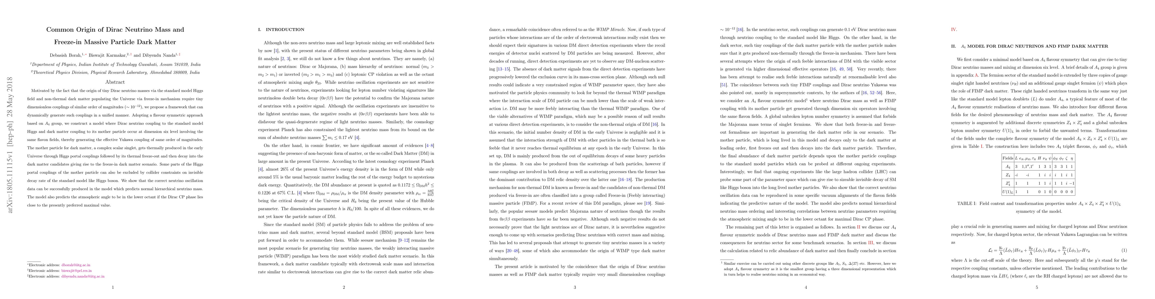 Motivated by the fact that the origin of tiny Dirac neutrino masses via the standard model Higgs field and non-thermal dark matter populating the Universe via freeze-in mechanism require tiny dimensionless couplings of similar order of magnitudes $(\sim 10^{-12})$, we propose a framework that can dynamically generate such couplings in a unified manner. Adopting a flavour symmetric approach based on $A_4$ group, we construct a model where Dirac neutrino coupling to the standard model Higgs and dark matter coupling to its mother particle occur at dimension six level involving the same flavon fields, thereby generating the effective Yukawa coupling of same order of magnitudes. The mother particle for dark matter, a complex scalar singlet, gets thermally produced in the early Universe through Higgs portal couplings followed by its thermal freeze-out and then decay into the dark matter candidates giving rise to the freeze-in dark matter scenario. Some parts of the Higgs portal couplings of the mother particle can also be excluded by collider constraints on invisible decay rate of the standard model like Higgs boson. We show that the correct neutrino oscillation data can be successfully produced in the model which predicts normal hierarchical neutrino mass. The model also predicts the atmospheric angle to be in the lower octant if the Dirac CP phase lies close to the presently preferred maximal value.
