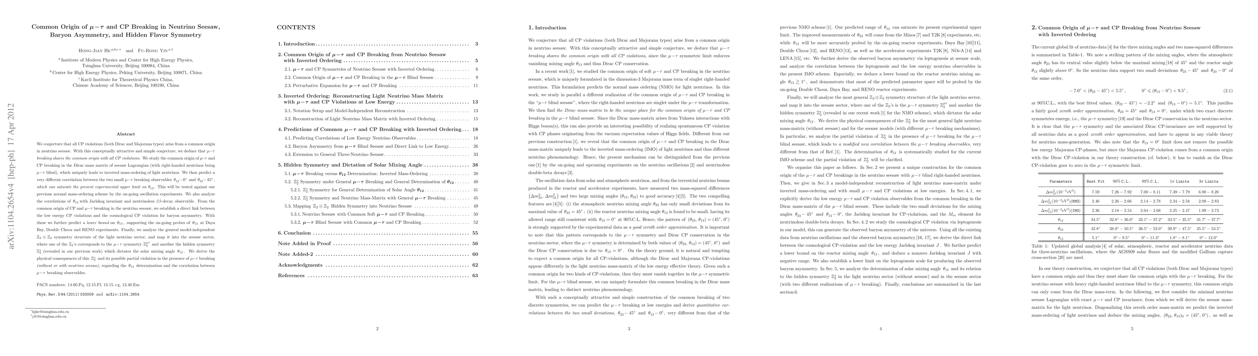 We conjecture that all CP violations (both Dirac and Majorana types) arise from a common origin in neutrino seesaw. With this conceptually attractive and simple conjecture, we deduce that mu-tau breaking shares the common origin with all CP violations. We study the common origin of mu-tau and CP breaking in the Dirac mass matrix of seesaw Lagrangian (with right-handed neutrinos being mu-tau blind), which uniquely leads to inverted mass-ordering of light neutrinos. We then predict a very different correlation between the two small mu-tau breaking observables theta_{13}-0 and theta_{23}-45, which can saturate the present experimental upper limit on theta_{13}. This will be tested against our previous normal mass-ordering scheme by the on-going oscillation experiments. We also analyze the correlations of theta_{13} with Jarlskog invariant and neutrinoless double-beta-decay observable. From the common origin of CP and mu-tau breaking in the neutrino seesaw, we establish a direct link between the low energy CP violations and the cosmological CP violation for baryon asymmetry. With these we further predict a lower bound on theta_{13}, supporting the on-going probes of theta_{13} at Daya Bay, Double Chooz and RENO experiments. Finally, we analyze the general model-independent Z_2 x Z_2 symmetry structure of the light neutrino sector, and map it into the seesaw sector, where one of the Z_2's corresponds to the mu-tau symmetry and another the hidden symmetry Z_2^s (revealed in our previous work) which dictates the solar mixing angle \theta_{12}. We derive the physical consequences of this Z_2^s and its possible partial violation in the presence of mu-tau breaking (without or with neutrino seesaw), regarding the theta_{12} determination and the correlation between mu-tau breaking observables.