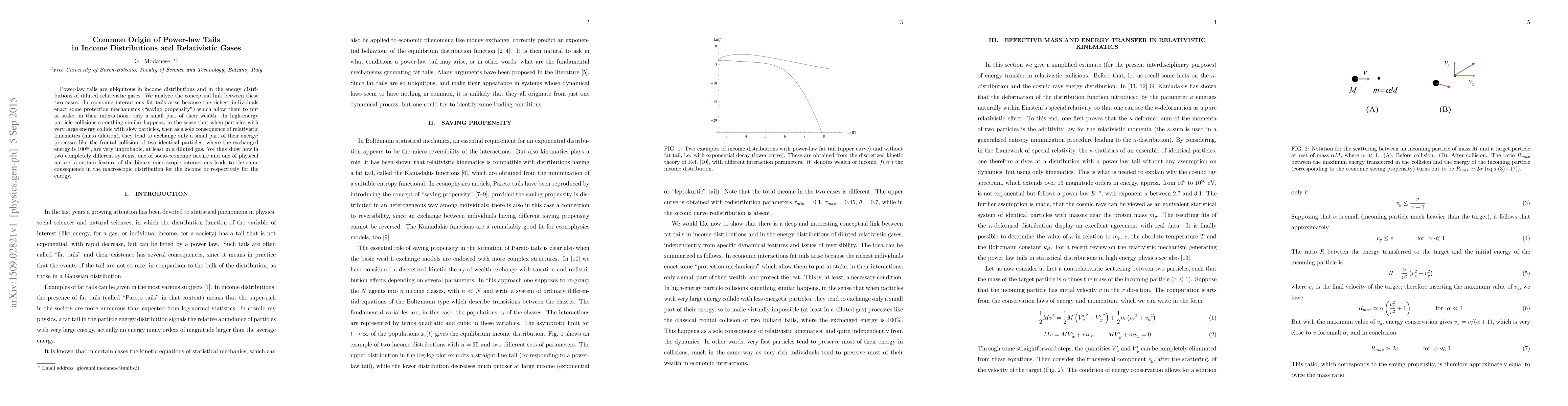 Power-law tails are ubiquitous in income distributions and in the energy distributions of diluted relativistic gases. We analyze the conceptual link between these two cases. In economic interactions fat tails arise because the richest individuals enact some protection mechanisms ("saving propensity") which allow them to put at stake, in their interactions, only a small part of their wealth. In high-energy particle collisions something similar happens, in the sense that when particles with very large energy collide with slow particles, then as a sole consequence of relativistic kinematics (mass dilation), they tend to exchange only a small part of their energy; processes like the frontal collision of two identical particles, where the exchanged energy is 100%, are very improbable, at least in a diluted gas. We thus show how in two completely different systems, one of socio-economic nature and one of physical nature, a certain feature of the binary microscopic interactions leads to the same consequence in the macroscopic distribution for the income or respectively for the energy.