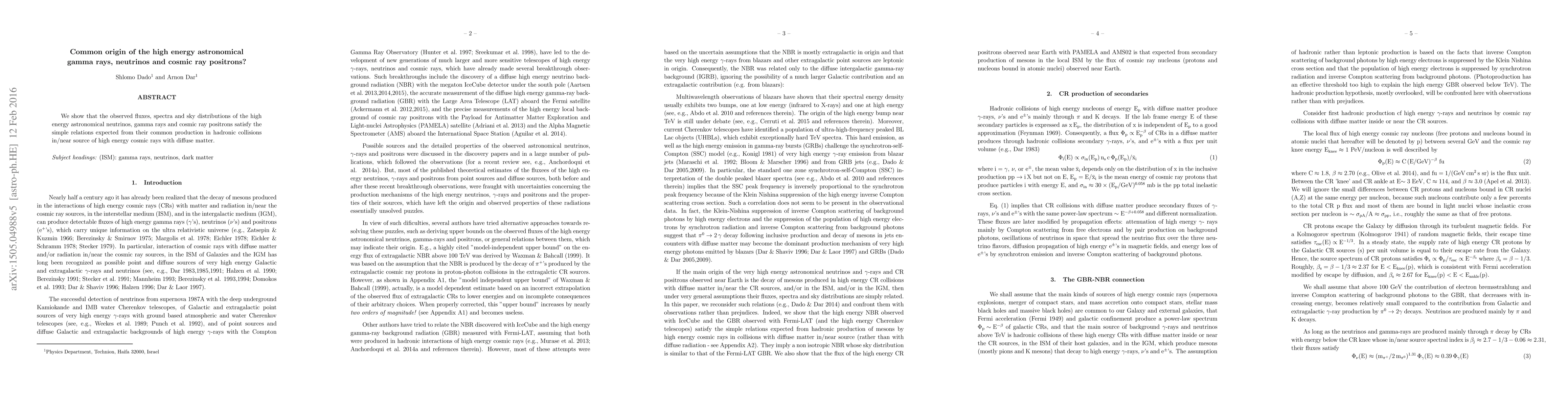 We show that the observed fluxes, spectra and sky distributions of the high energy diffuse backgrounds of astronomical neutrinos, gamma rays and cosmic ray positrons satisfy simple relations expected from their common production in hadronic collisions of high energy cosmic rays (CRs) with diffuse matter. This provides compelling evidence that the high energy neutrino, gamma ray, and positron backgrounds have a common origin - hadronic meson production by cosmic rays in our Galaxy and in external galaxies rather than through the decay/annihilation of dark matter particles.