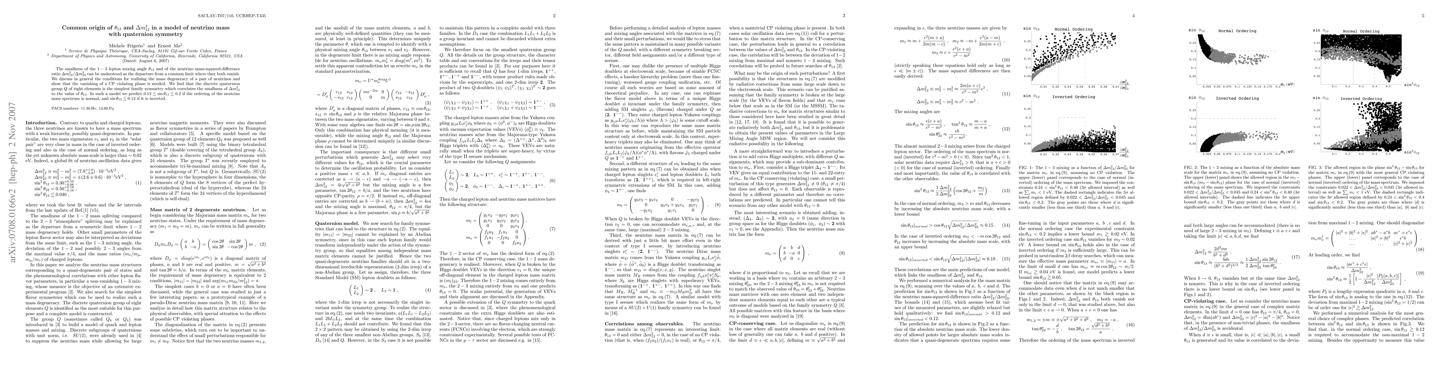 The smallness of the 1-3 lepton mixing angle $\theta_{13}$ and of the neutrino mass-squared-difference ratio $\Delta m^2_{12}/\Delta m^2_{23}$ can be understood as the departure from a common limit where they both vanish. We discuss in general the conditions for realizing the mass degeneracy of a pair of neutrinos and show that the vanishing of a CP violating phase is needed. We find that the discrete quaternion group Q of eight elements is the simplest family symmetry which correlates the smallness of $\Delta m^2_{12}$ to the value of $\theta_{13}$. In such a model we predict $0.12\lesssim \sin\theta_{13} \lesssim 0.2$ if the ordering of the neutrino mass spectrum is normal, and $\sin\theta_{13}\lesssim 0.12$ if it is inverted.