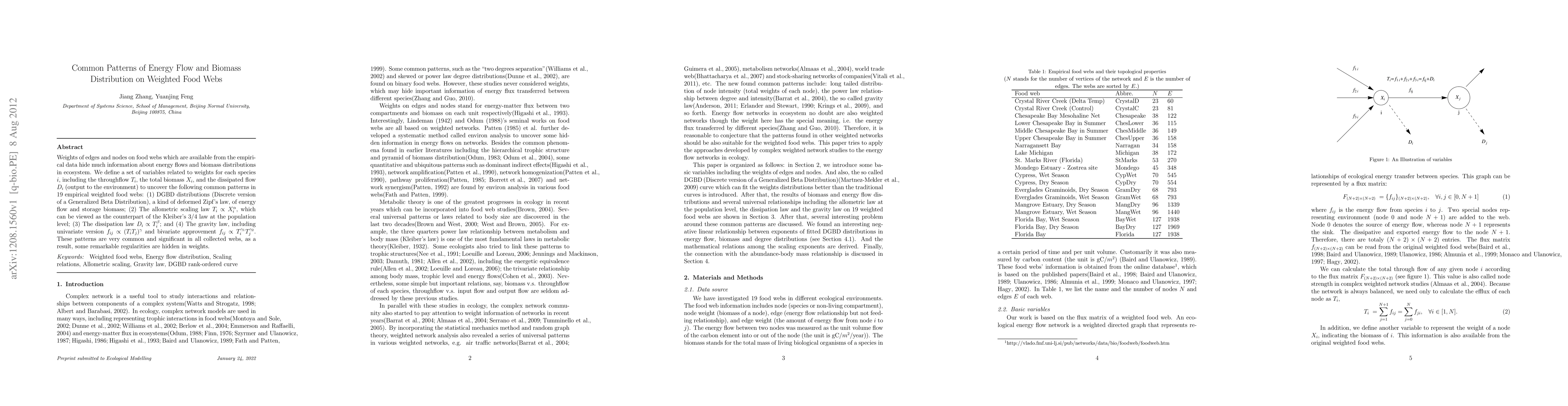 This paper investigates common patterns in energy flow and biomass distribution across 19 empirical weighted food webs, revealing DGBD distributions, an allometric scaling law, a dissipation law, and a gravity law governing interactions. These findings highlight significant regularities hidden within the weights of food webs.