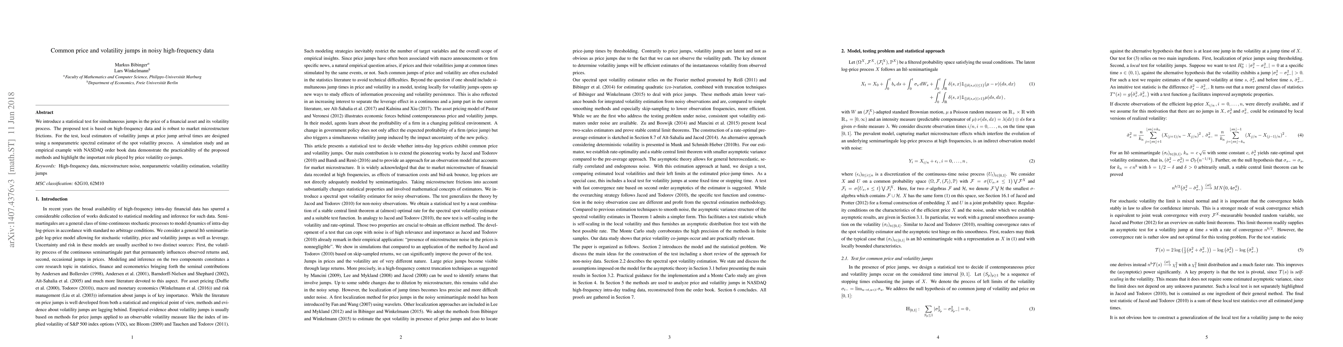 This paper proposes a statistical test for detecting simultaneous jumps in both the price and volatility of financial assets using high-frequency data. The test is robust to market microstructure noise and employs a nonparametric spectral estimator for local volatility jumps, validated through simulations and an empirical analysis of NASDAQ data.