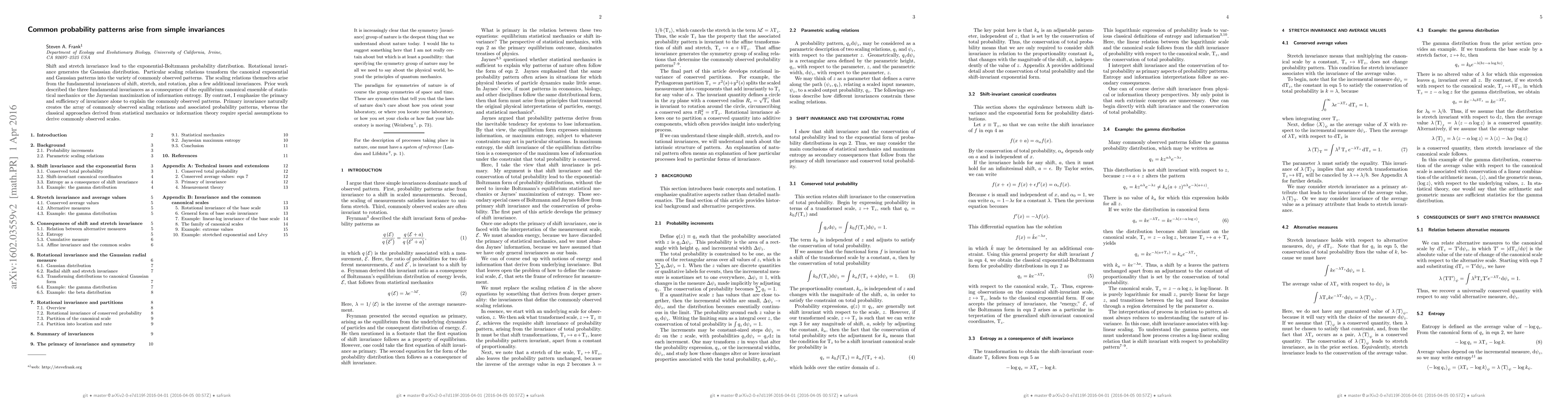 Shift and stretch invariance lead to the exponential-Boltzmann probability distribution. Rotational invariance generates the Gaussian distribution. Particular scaling relations transform the canonical exponential and Gaussian patterns into the variety of commonly observed patterns. The scaling relations themselves arise from the fundamental invariances of shift, stretch, and rotation, plus a few additional invariances. Prior work described the three fundamental invariances as a consequence of the equilibrium canonical ensemble of statistical mechanics or the Jaynesian maximization of information entropy. By contrast, I emphasize the primacy and sufficiency of invariance alone to explain the commonly observed patterns. Primary invariance naturally creates the array of commonly observed scaling relations and associated probability patterns, whereas the classical approaches derived from statistical mechanics or information theory require special assumptions to derive commonly observed scales.