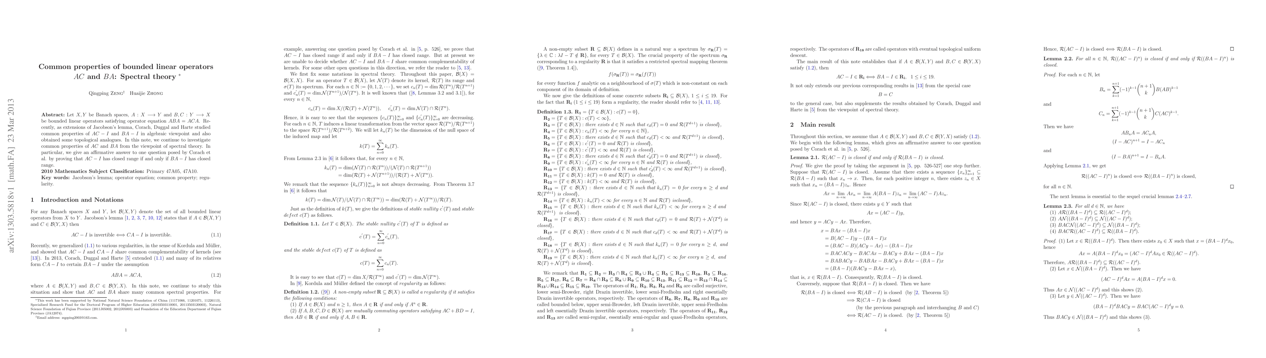Let $X,Y$ be Banach spaces, $A:X \longrightarrow Y$ and $B,C:Y \longrightarrow X$ be bounded linear operators satisfying operator equation $ABA=ACA$. Recently, as extensions of Jacobson's lemma, Corach, Duggal and Harte studied common properties of $AC-I$ and $BA-I$ in algebraic viewpoint and also obtained some topological analogues. In this note, we continue to investigate common properties of $AC$ and $BA$ from the viewpoint of spectral theory. In particular, we give an affirmative answer to one question posed by Corach et al. by proving that $AC - I$ has closed range if and only if $BA - I$ has closed range.