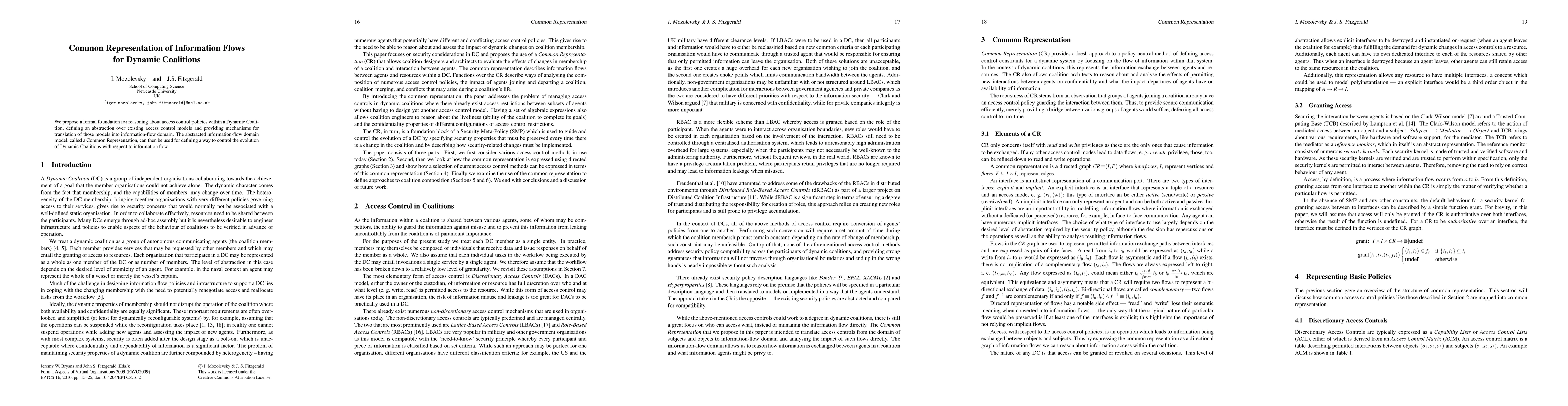 This paper introduces a formal foundation for access control policies in Dynamic Coalitions, abstracting existing models into a Common Representation for information-flow control, enabling the management of coalition evolution based on information dynamics.