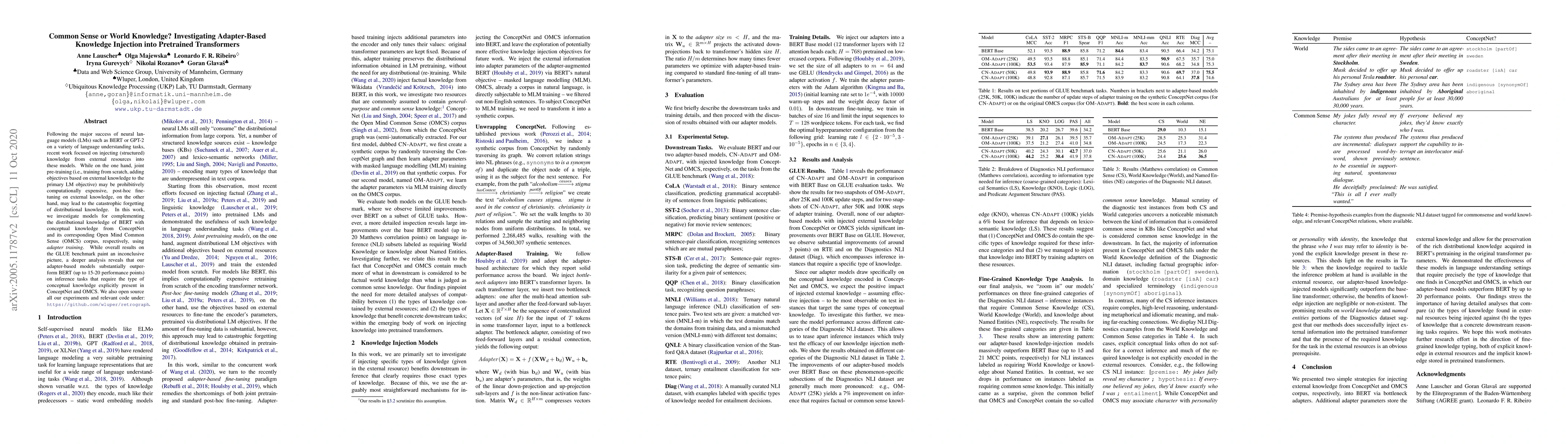 Researchers investigated adding conceptual knowledge from ConceptNet to BERT using adapter training, finding that it substantially outperforms BERT on inference tasks requiring specific domain expertise.