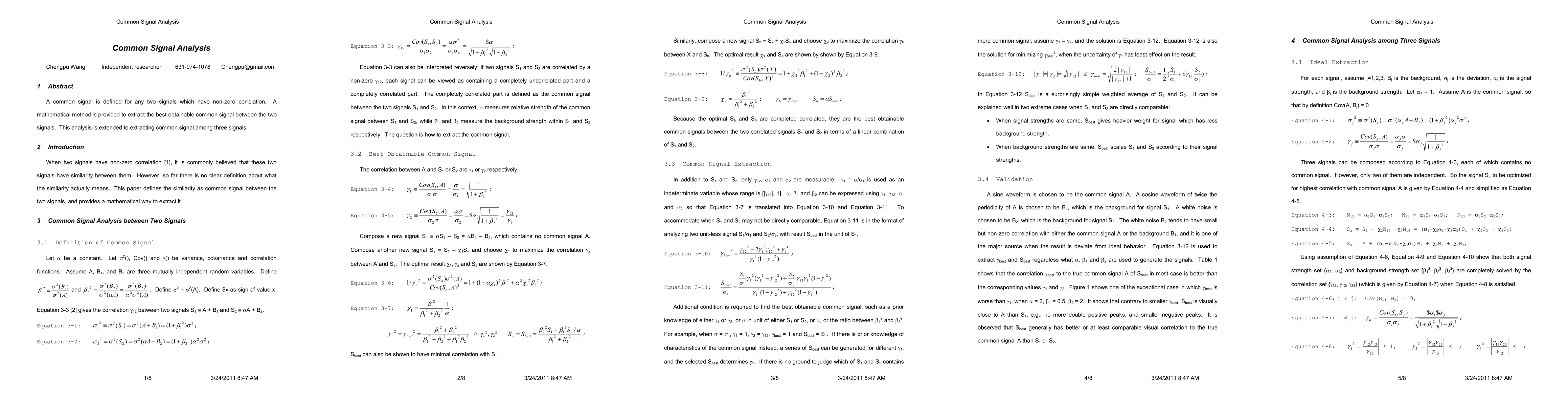 A common signal is defined for any two signals which have non-zero correlation. A mathematical method is provided to extract the best obtainable common signal between the two signals. This analysis is extended to extracting common signal among three signals.