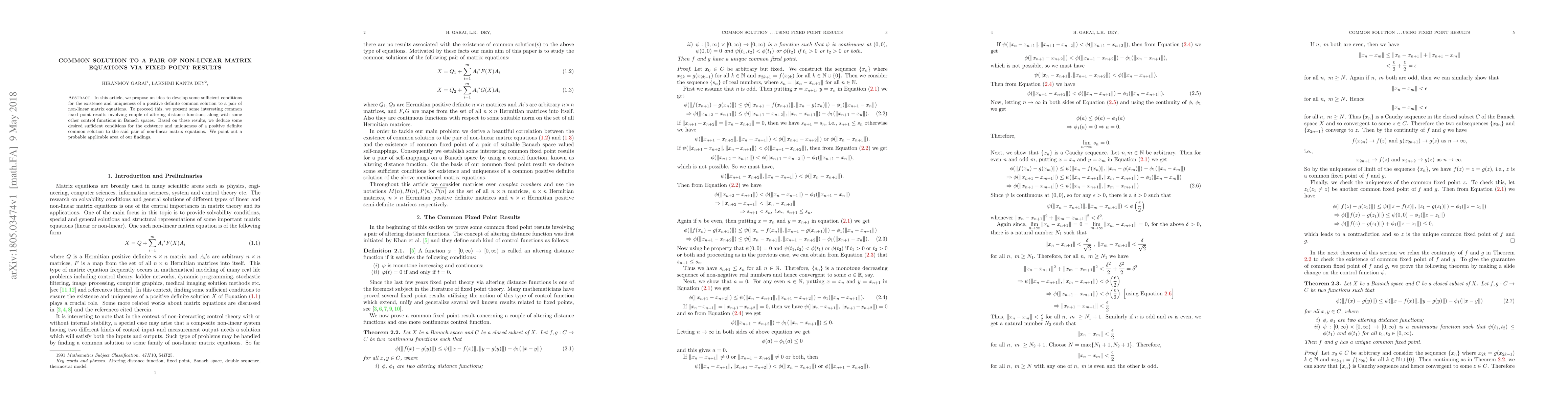 In this article, we propose an idea to develop some sufficient conditions for the existence and uniqueness of a positive definite common solution to a pair of non-linear matrix equations. To proceed this, we present some interesting common fixed point results involving couple of altering distance functions along with some other control functions in Banach spaces. Based on these results, we deduce some desired sufficient conditions for the existence and uniqueness of a positive definite common solution to the said pair of non-linear matrix equations. We point out a probable applicable area of our findings.