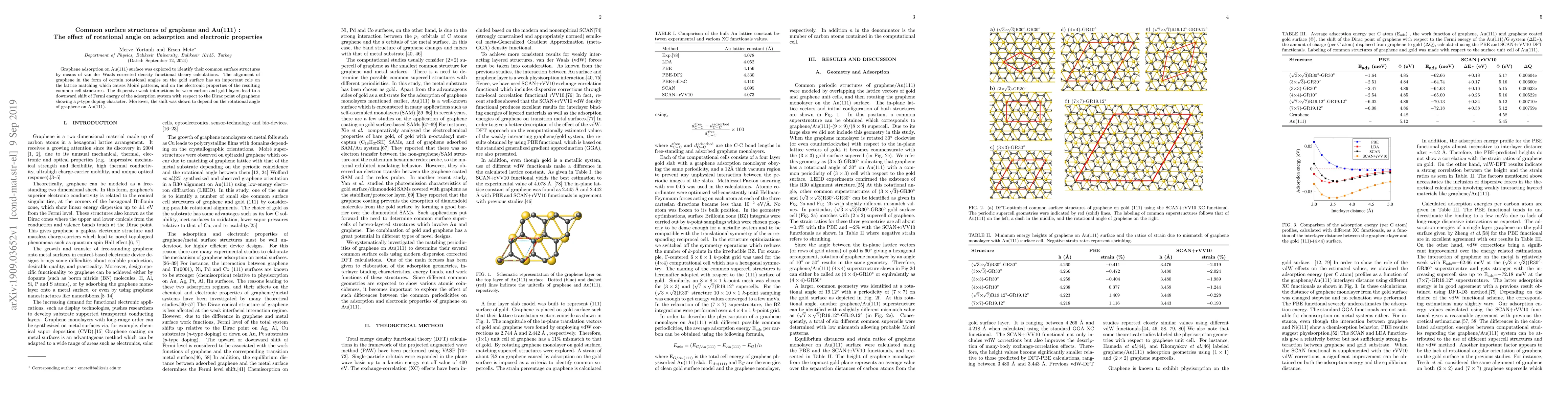 This study uses van der Waals corrected DFT calculations to reveal that graphene's adsorption on Au(111) forms common surface structures influenced by graphene's rotational angle. The alignment causes Moiré patterns and alters electronic properties, resulting in p-type doping of the graphene system, with Fermi energy shift dependent on the rotational angle.